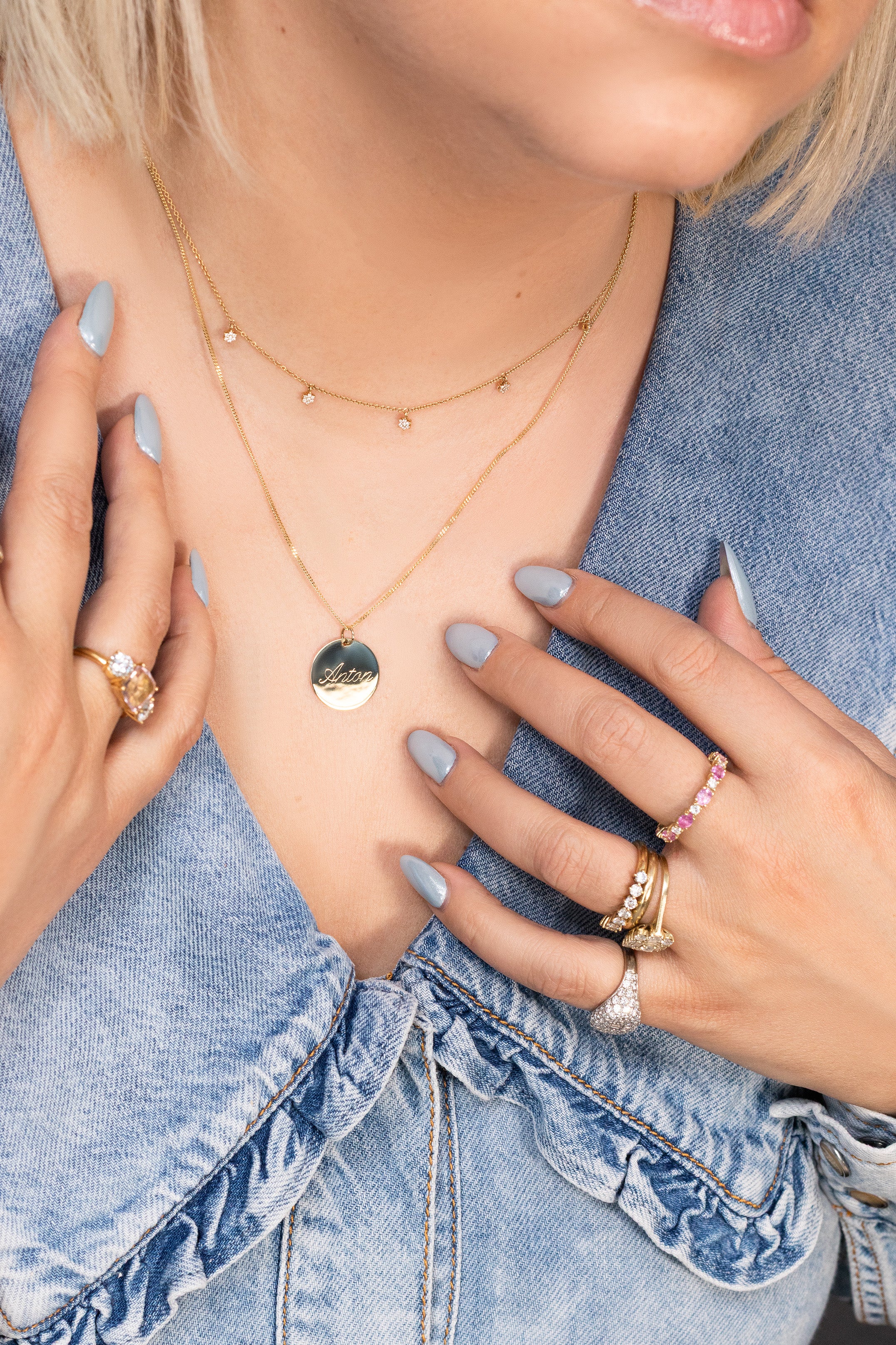 Besonders schön wird der personalisierte Goldschmuck durch die Auswahl an Edelsteinen, mit denen Du Deine Stücke individuell gestalten kannst. Der Ring ASTRONOMIC SAPPHIRES etwa ist in 12 Edelsteinvarianten erhältlich, die jeweils für einen Geburtsmonat stehen. So kannst Du beispielsweise die Geburtsmonate Deiner Kinder in Deinem Schmuckstück verewigen – eine wunderschöne Art, die Verbindung zu Deinen Liebsten zu zeigen. Oder kombiniere mehrere Edelsteine im Stacking mit dem Ring FLORENCE, um ein atemberaubendes Farbspiel an Deinen Händen zu kreieren.