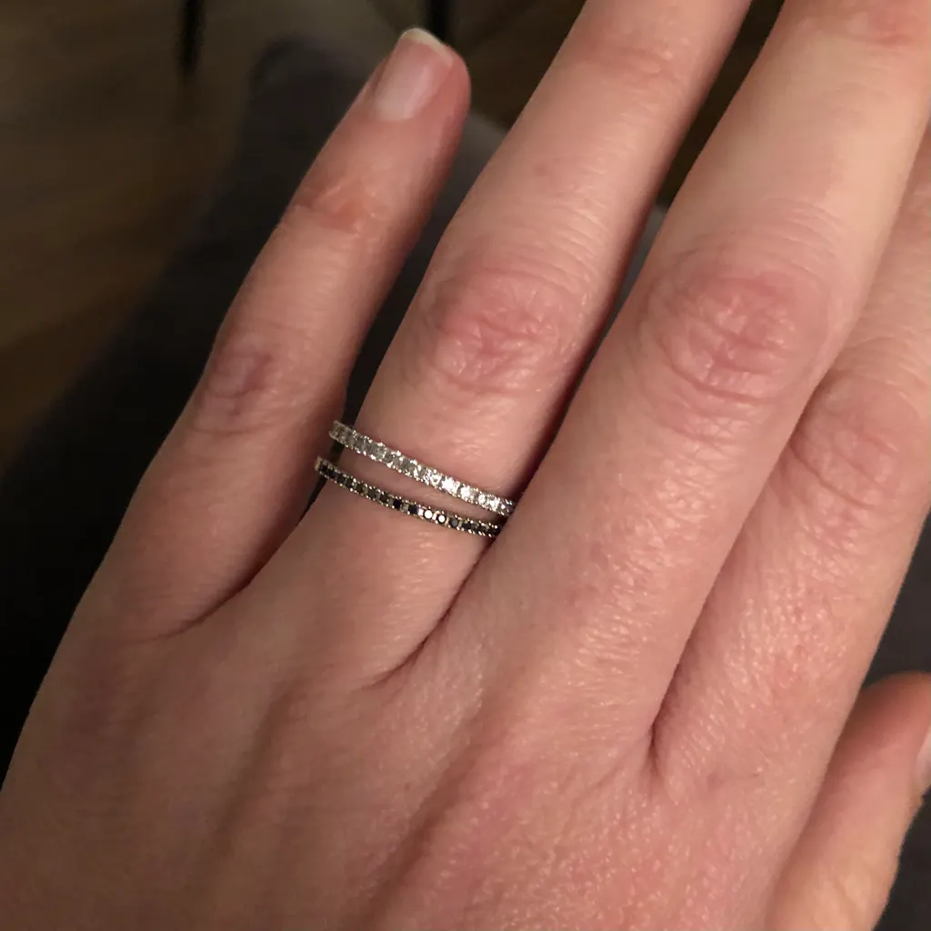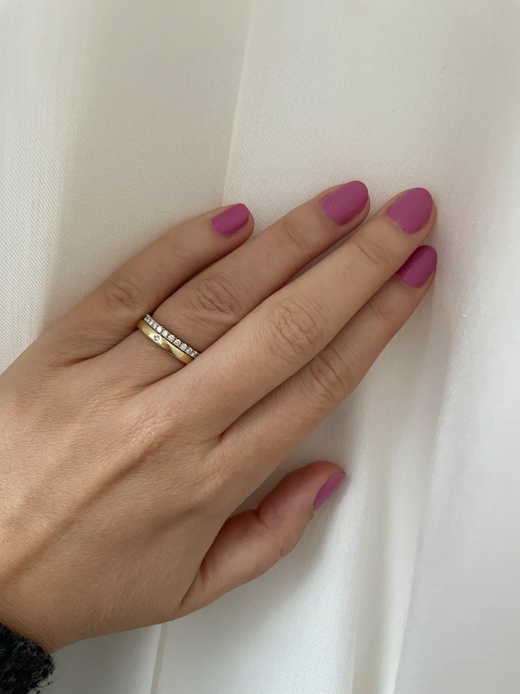 AMELIA ist unser ganz klassischer Memoire-/Celebrationring. Viele kleine Diamanten sind auf der Ringschiene gefasst und dabei umlaufend schön. Einzeln oder im Zusammenspiel mit anderen Ringen, passt AMELIA einfach immer. Die Ringschiene ist bei uns entweder zu 2/3 mit Diamanten besetzt, so dass die Ringgröße im Nachhinein noch leicht verändert werden kann und der Ring insgesamt weniger stoßempfindlich wird. Wir bieten unseren Ring AMELIA aber auch als rundumgefasste Version an. Diese sieht am Zeigefinger besonders elegant aus, da Du dort den Ring von allen Seiten aus strahlen sehen kannst. Auch am Ringfinger ist eine rundumgefasste Ringschiene hübsch und auffällig. Ob 2/3 oder rundumgefasst ist einfach Geschmackssache. Unser Ring AMELIA passt perfekt zu unserem Solitärring DIANA.