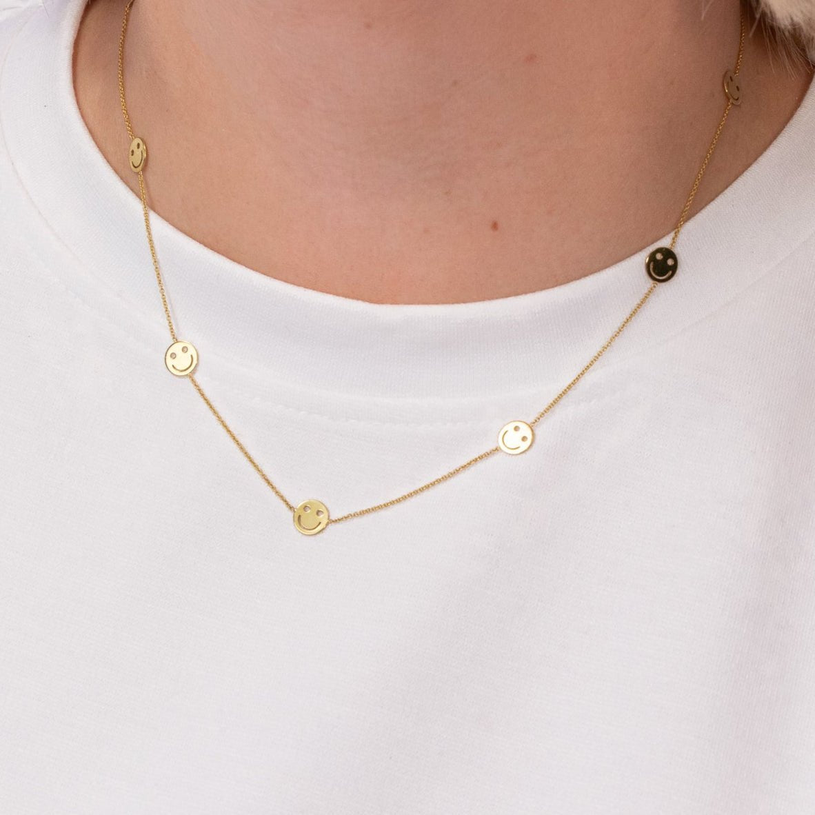 Mit unserer Kette HATI SMILE trägst Du ein Stück Leichtigkeit und gute Laune immer bei Dir. An einer feinen goldenen Rundankerkette reihen sich sieben fröhliche Smiley-Anhänger, die Dich jeden Tag daran erinnern, wie schön es ist, einfach zu lächeln.