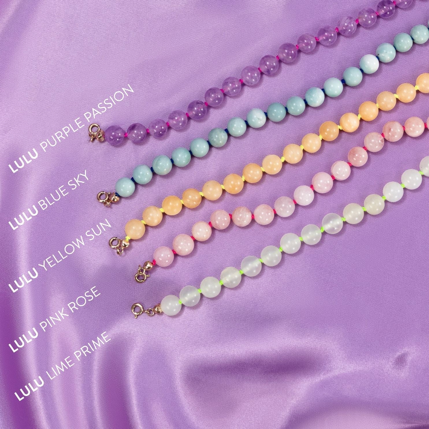 Unsere LULU kommen in den fünf Farben: Blue Sky (Amazonit), Purple Passion (Amethyst Lavendel), Yellow Sun (Calcit), Lime Prime (Jade) und Pink Rose (Morganit).