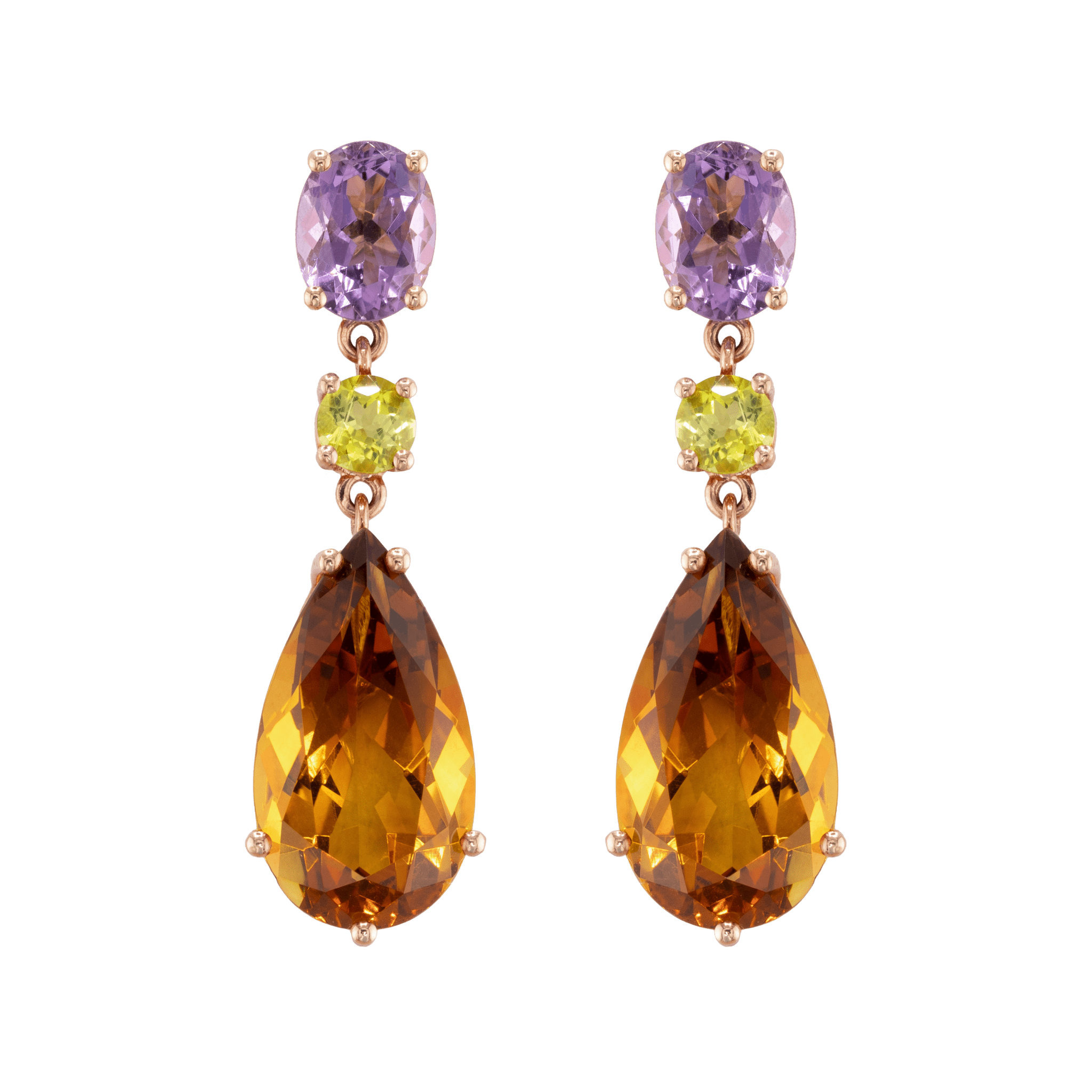Form: 2 Amethyst flieder ca. 9x7 mm facettiert & ca. 2 Limonenquarz gelb (beh.) 5 mm facettiert & 2 Citrin palmeira ca. 20x11 mm Tropfenform facettiert