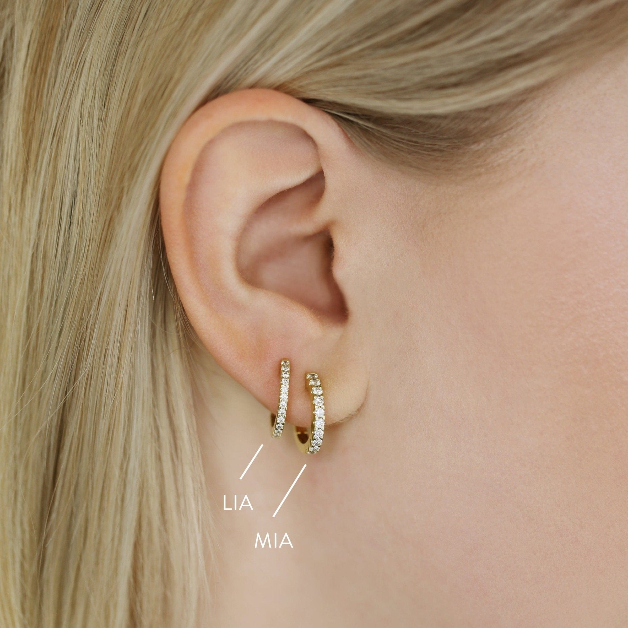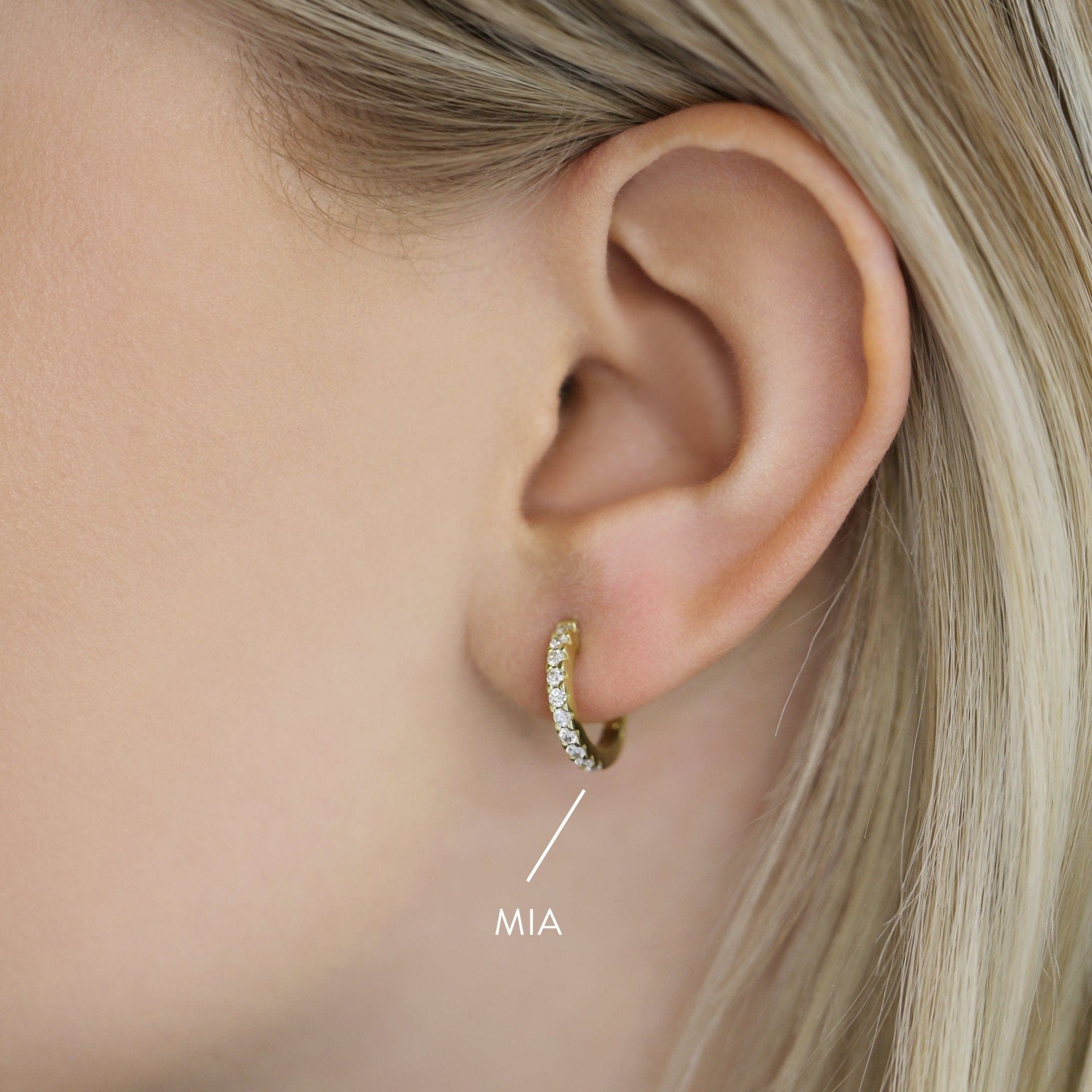 MIA ist wie eine große Schwester, always classy & chic. Die Goldcreole ist mit funkelnden, weißen Diamanten besetzt, die unfassbar schön strahlen und einfach jedem Outfit einen Hauch Glamour verleiht. Egal ob lässig zur Jeans oder zum Cocktailkleid, MIA ist ein echter Allrounder und geht einfach immer. Die Creolen haben die perfekte Größe, sitzen angenehm am Ohr und lassen sich super fest verschließen, sodass Du Dir keine Sorgen machen müsst sie zu verlieren.