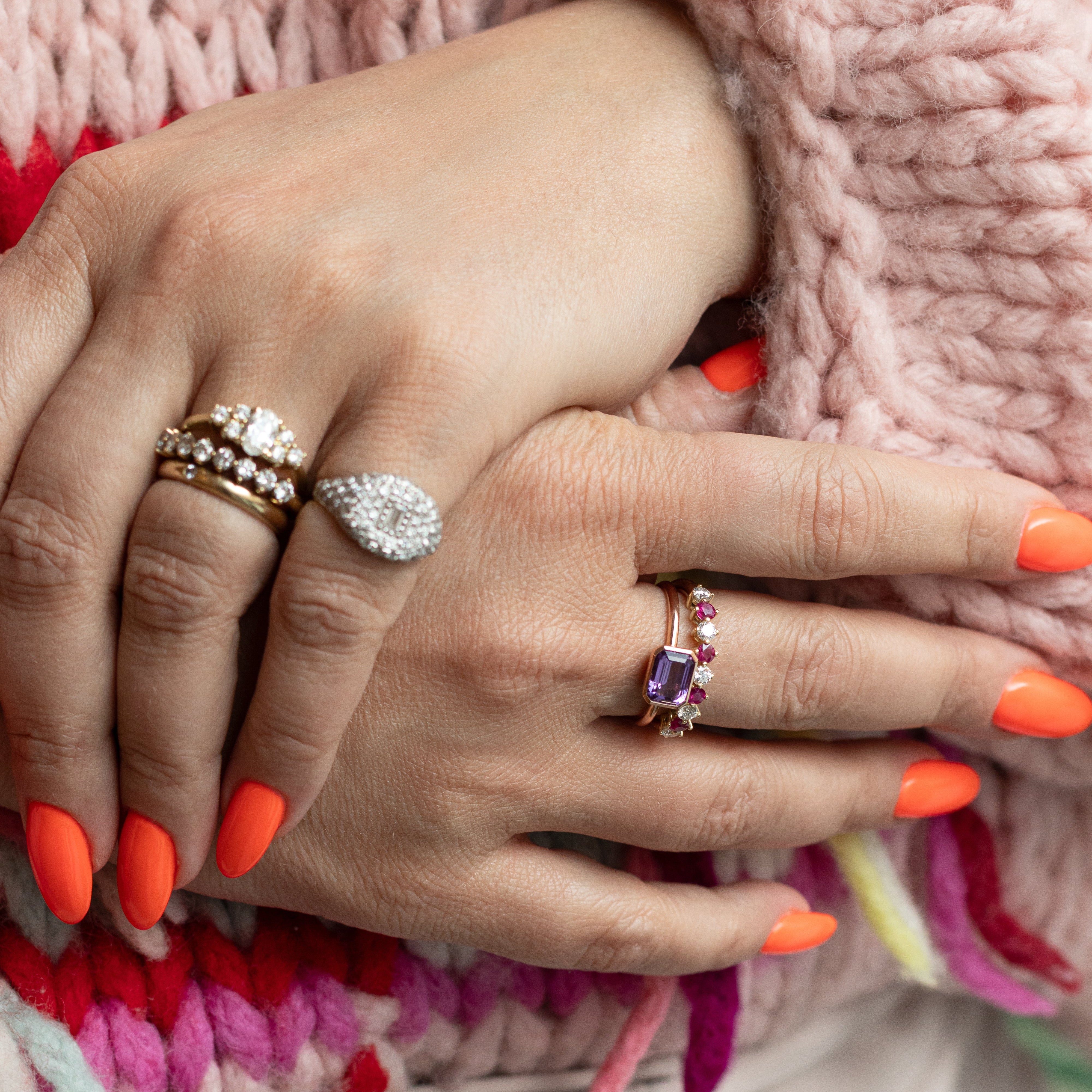 Für ein harmonisches Stacking empfehlen wir Dir, ANIKA mit der farbenfrohen ANGIE zu kombinieren – die fließenden Farbverläufe von Grün bis Blau schaffen einen wunderschönen Kontrast zur schlichten Eleganz von ANIKA. Ebenso begeistert die Kombination mit ANNA, deren verspielte, facettenreiche Edelsteine in Rot-, Pink- und Blautönen ANIKA perfekt ergänzen und gemeinsam einen einzigartigen Look für jeden Anlass zaubern.