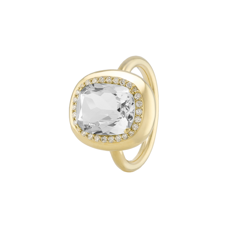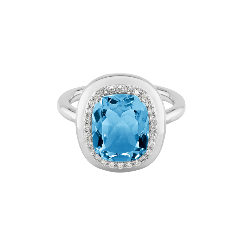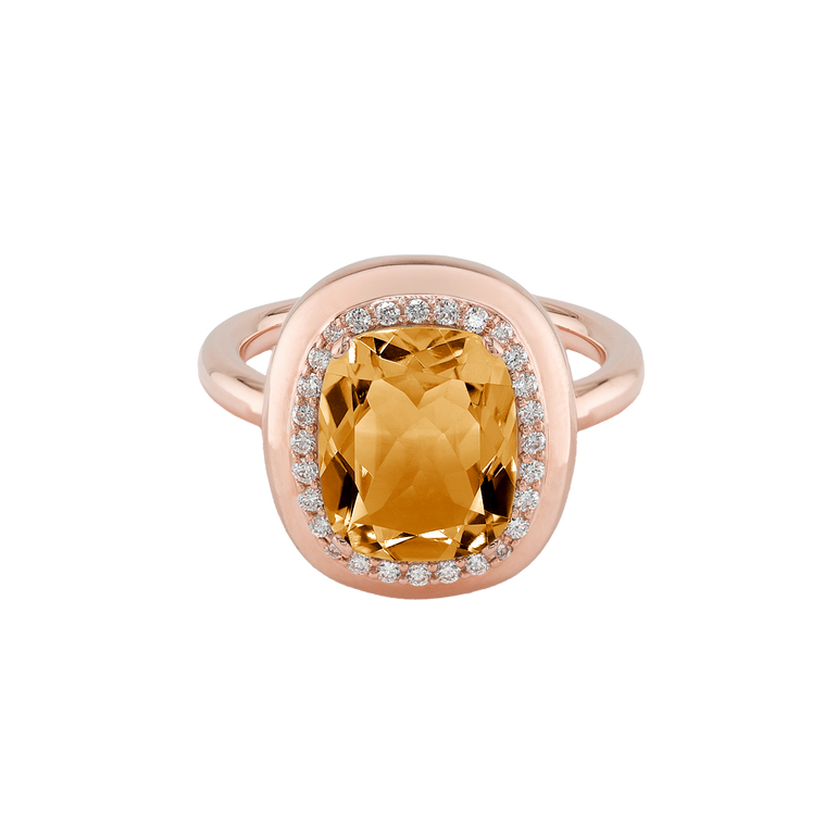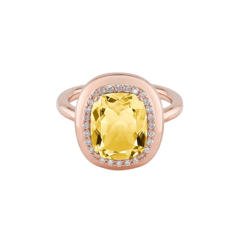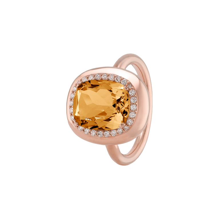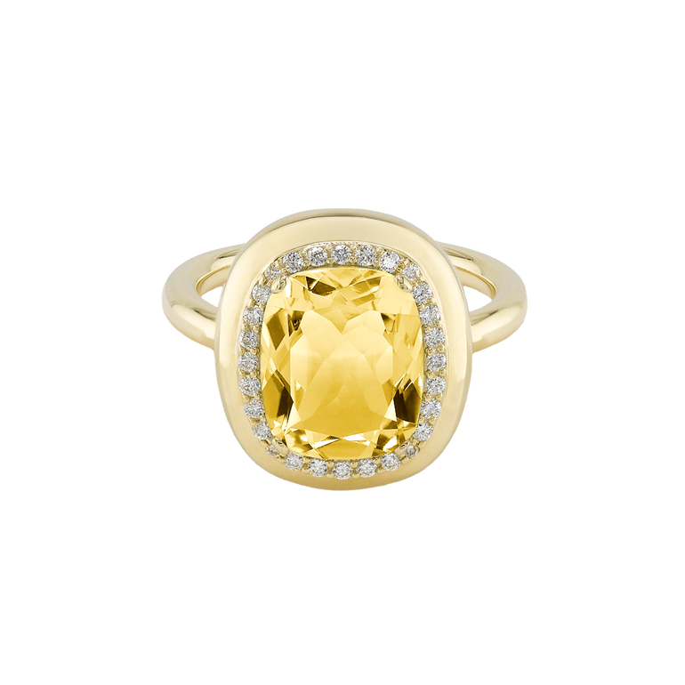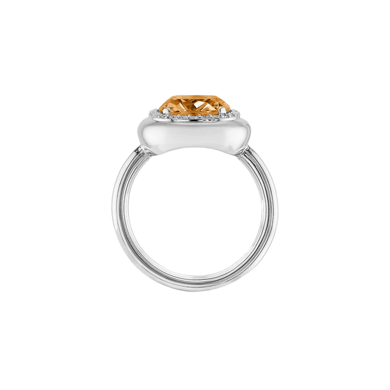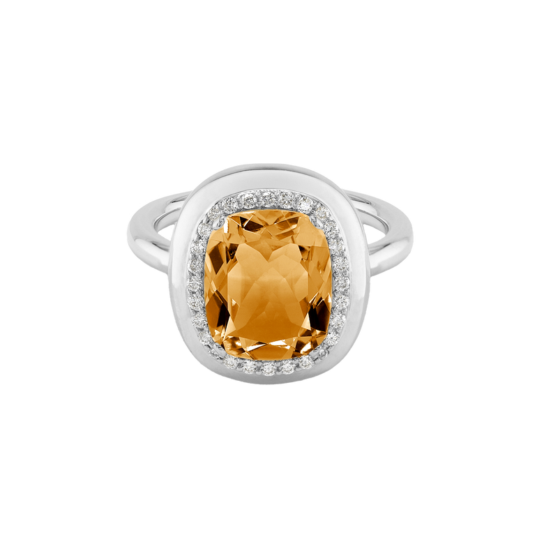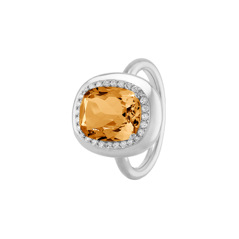 CLEMENTINE ist ein Ring, der sofort gute Laune macht. Der facettierte Mittelstein im Cushion Cut funkelt intensiv und wird von einem zarten Halo aus Brillanten umrahmt – wie Sonnenstrahlen, die das Licht einfangen.Das Design kombiniert klare Formen mit einem sanft abgerundeten Rahmen, wodurch CLEMENTINE zugleich klassisch und modern wirkt. Dieser Ring passt zum eleganten Kleid genauso wie zum unkomplizierten Alltagslook und sorgt immer für einen dezenten, aber unverkennbaren Look. Ob mit einem himmelblauen Topas, einem zartem Rosaquarz oder einem leuchtendem Madeira Citrin: Jeder Edelstein CLEMENTINE erzählt Deine eigene Geschichte – leicht, lebendig und voller Strahlkraft.CLEMENTINE ist kein Schmuckstück, das man einfach trägt. CLEMENTINE ist ein kleiner Moment von Glanz – Tag für Tag. Der Ring kann wunderbar mit GRACE, MALALA, TIFFI oder unserem Bestsellern ASTRONOMIC SAPPHIRES und SISSI kombiniert werden.