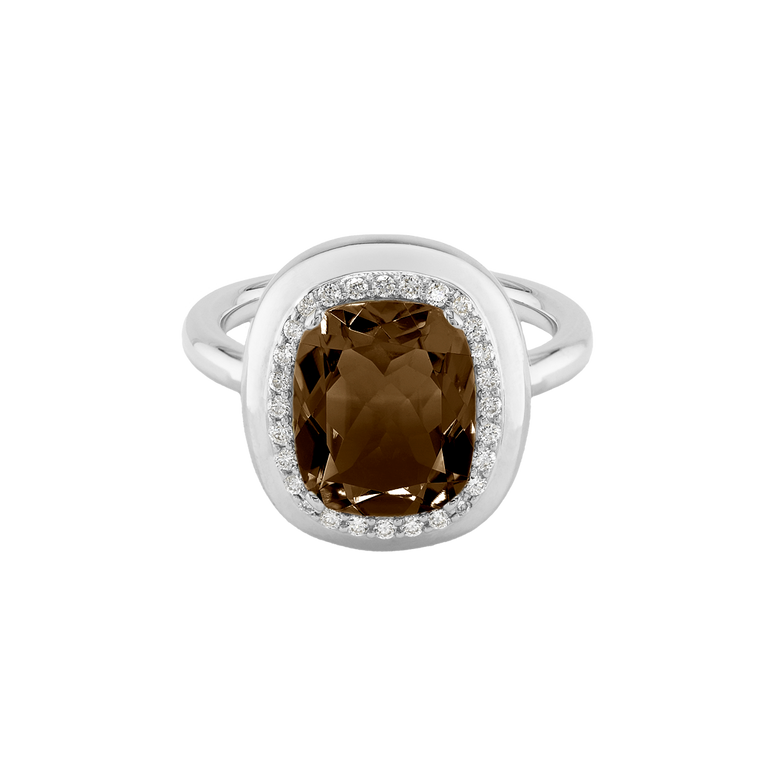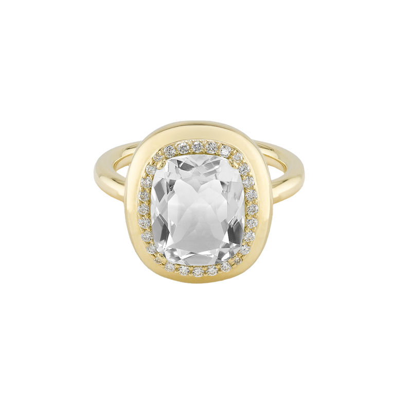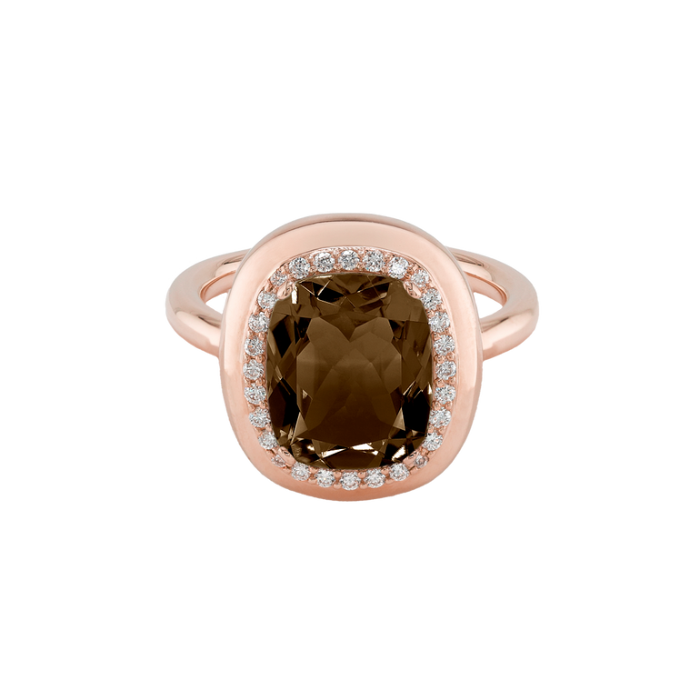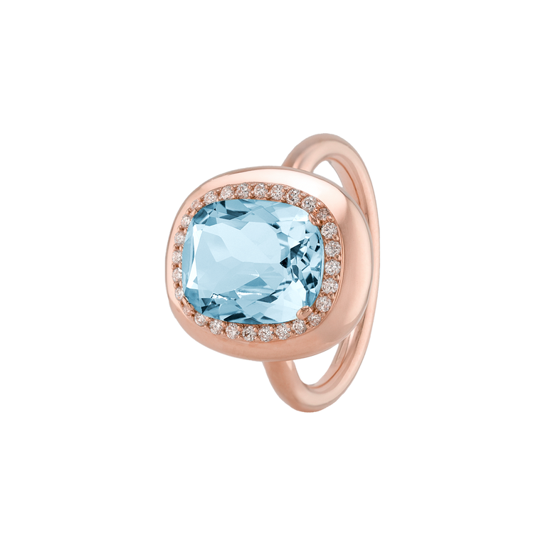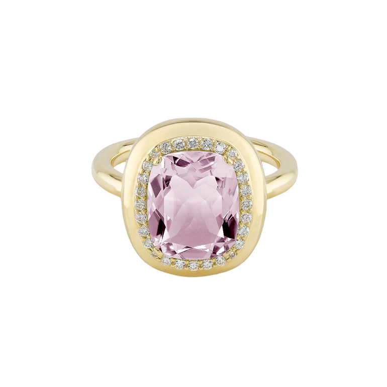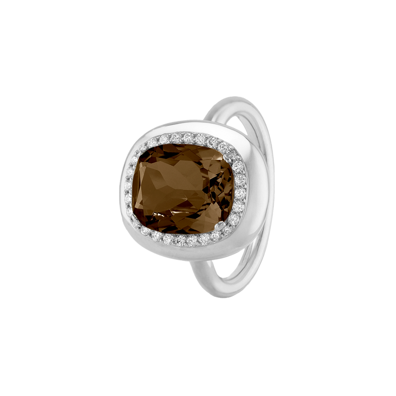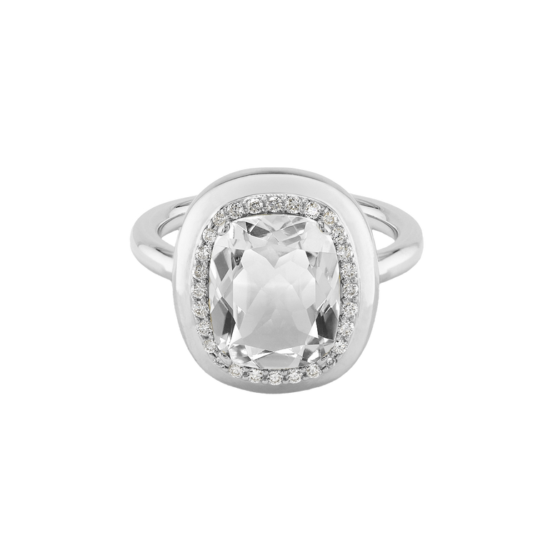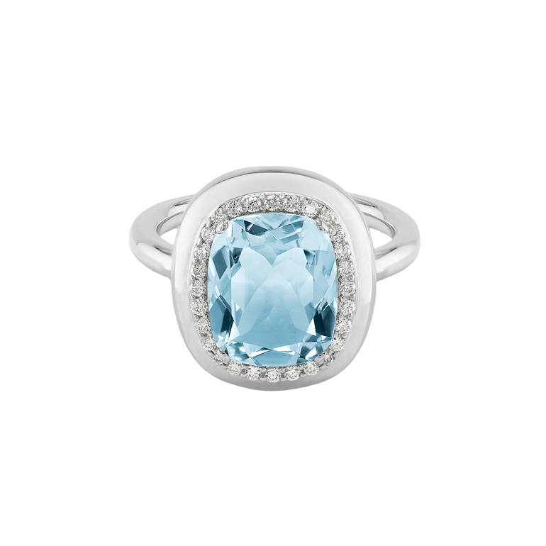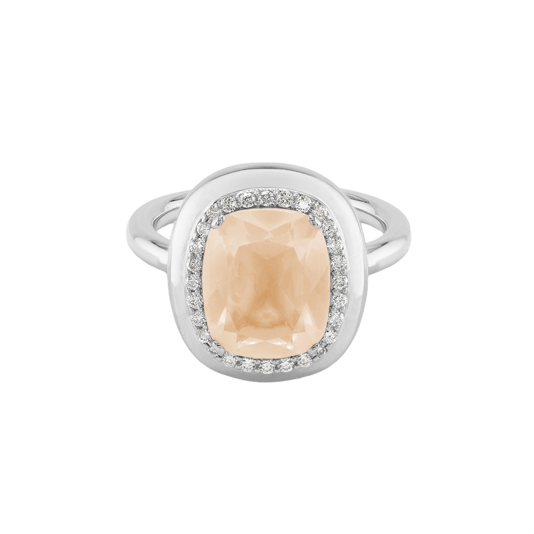 CLEMENTINE ist ein Ring, der sofort gute Laune macht. Der facettierte Mittelstein im Cushion Cut funkelt intensiv und wird von einem zarten Halo aus Brillanten umrahmt – wie Sonnenstrahlen, die das Licht einfangen.Das Design kombiniert klare Formen mit einem sanft abgerundeten Rahmen, wodurch CLEMENTINE zugleich klassisch und modern wirkt. Dieser Ring passt zum eleganten Kleid genauso wie zum unkomplizierten Alltagslook und sorgt immer für einen dezenten, aber unverkennbaren Look. Ob mit einem himmelblauen Topas, einem zartem Rosaquarz oder einem leuchtendem Madeira Citrin: Jeder Edelstein CLEMENTINE erzählt Deine eigene Geschichte – leicht, lebendig und voller Strahlkraft.CLEMENTINE ist kein Schmuckstück, das man einfach trägt. CLEMENTINE ist ein kleiner Moment von Glanz – Tag für Tag. Der Ring kann wunderbar mit GRACE, MALALA, TIFFI oder unserem Bestsellern ASTRONOMIC SAPPHIRES und SISSI kombiniert werden.