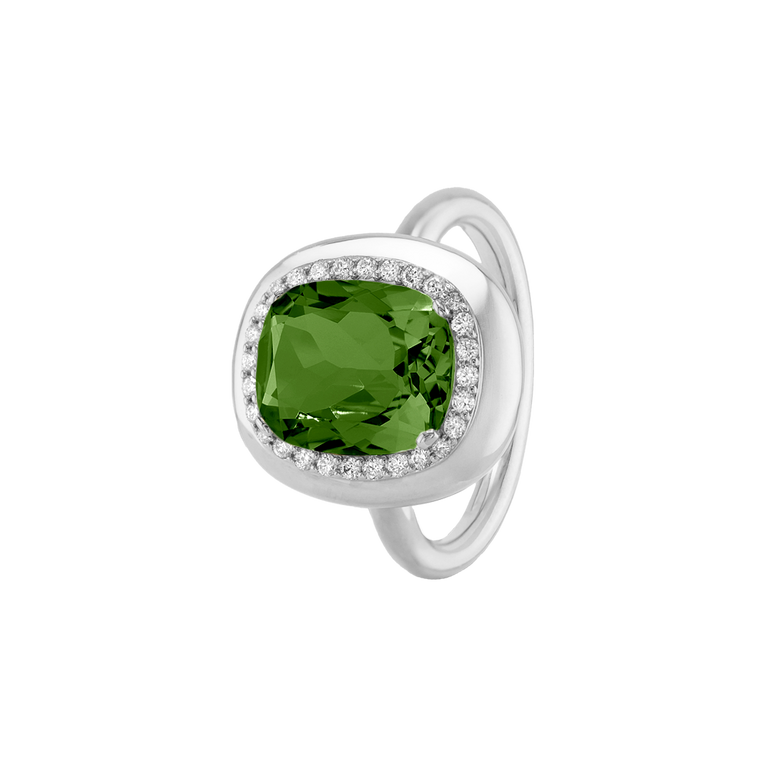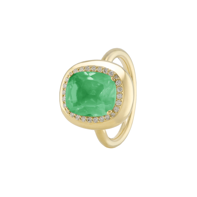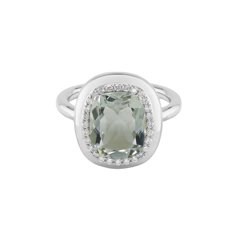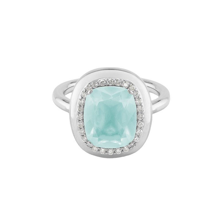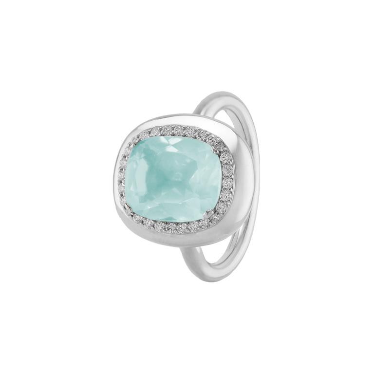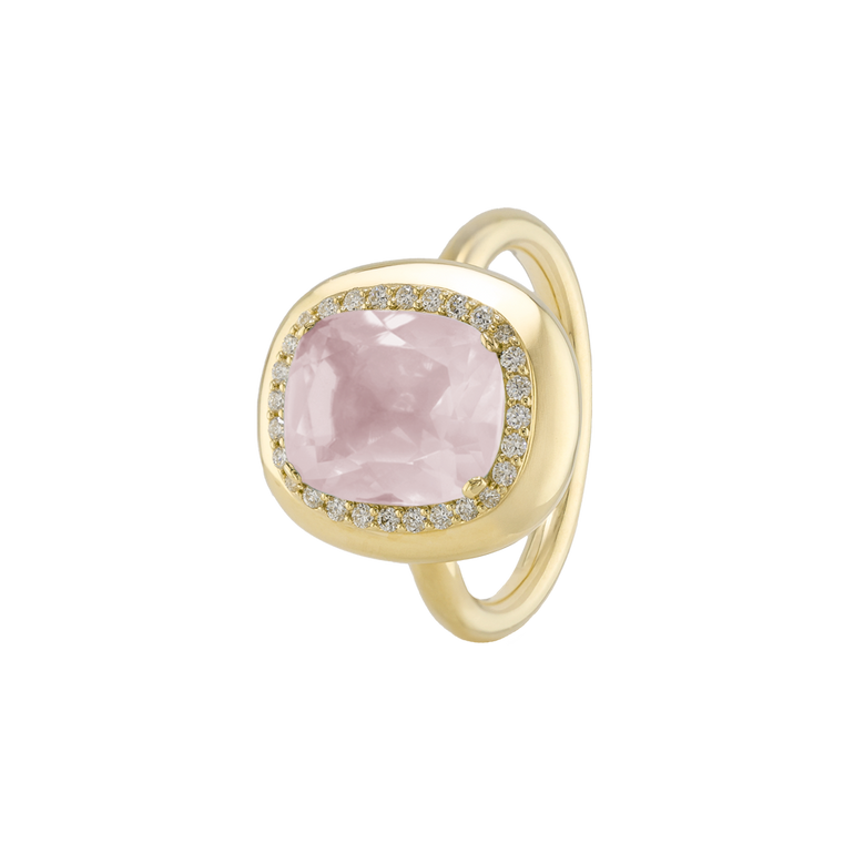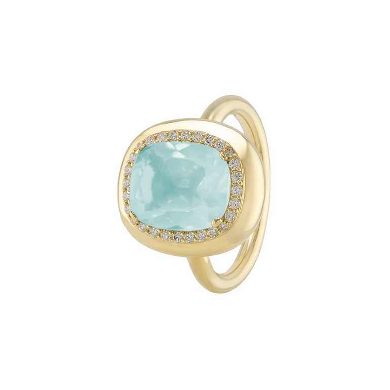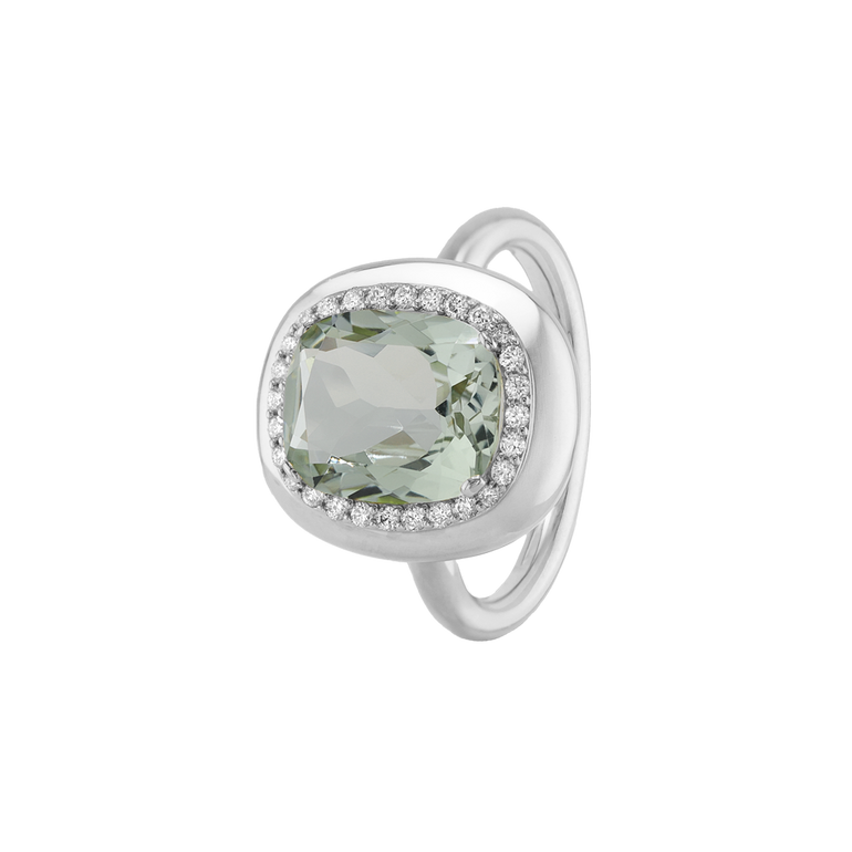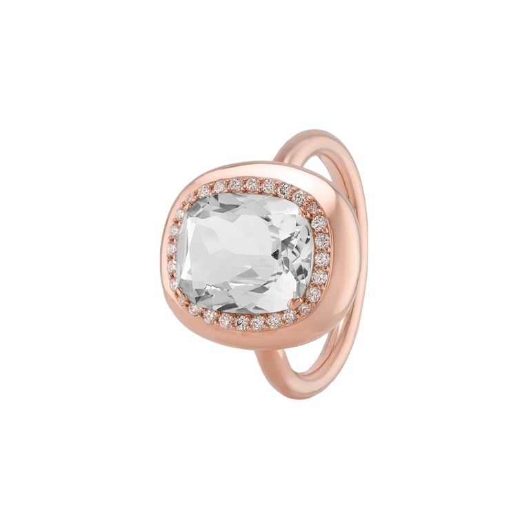 CLEMENTINE ist ein Ring, der sofort gute Laune macht. Der facettierte Mittelstein im Cushion Cut funkelt intensiv und wird von einem zarten Halo aus Brillanten umrahmt – wie Sonnenstrahlen, die das Licht einfangen.Das Design kombiniert klare Formen mit einem sanft abgerundeten Rahmen, wodurch CLEMENTINE zugleich klassisch und modern wirkt. Dieser Ring passt zum eleganten Kleid genauso wie zum unkomplizierten Alltagslook und sorgt immer für einen dezenten, aber unverkennbaren Look. Ob mit einem himmelblauen Topas, einem zartem Rosaquarz oder einem leuchtendem Madeira Citrin: Jeder Edelstein CLEMENTINE erzählt Deine eigene Geschichte – leicht, lebendig und voller Strahlkraft.CLEMENTINE ist kein Schmuckstück, das man einfach trägt. CLEMENTINE ist ein kleiner Moment von Glanz – Tag für Tag. Der Ring kann wunderbar mit GRACE, MALALA, TIFFI oder unserem Bestsellern ASTRONOMIC SAPPHIRES und SISSI kombiniert werden.