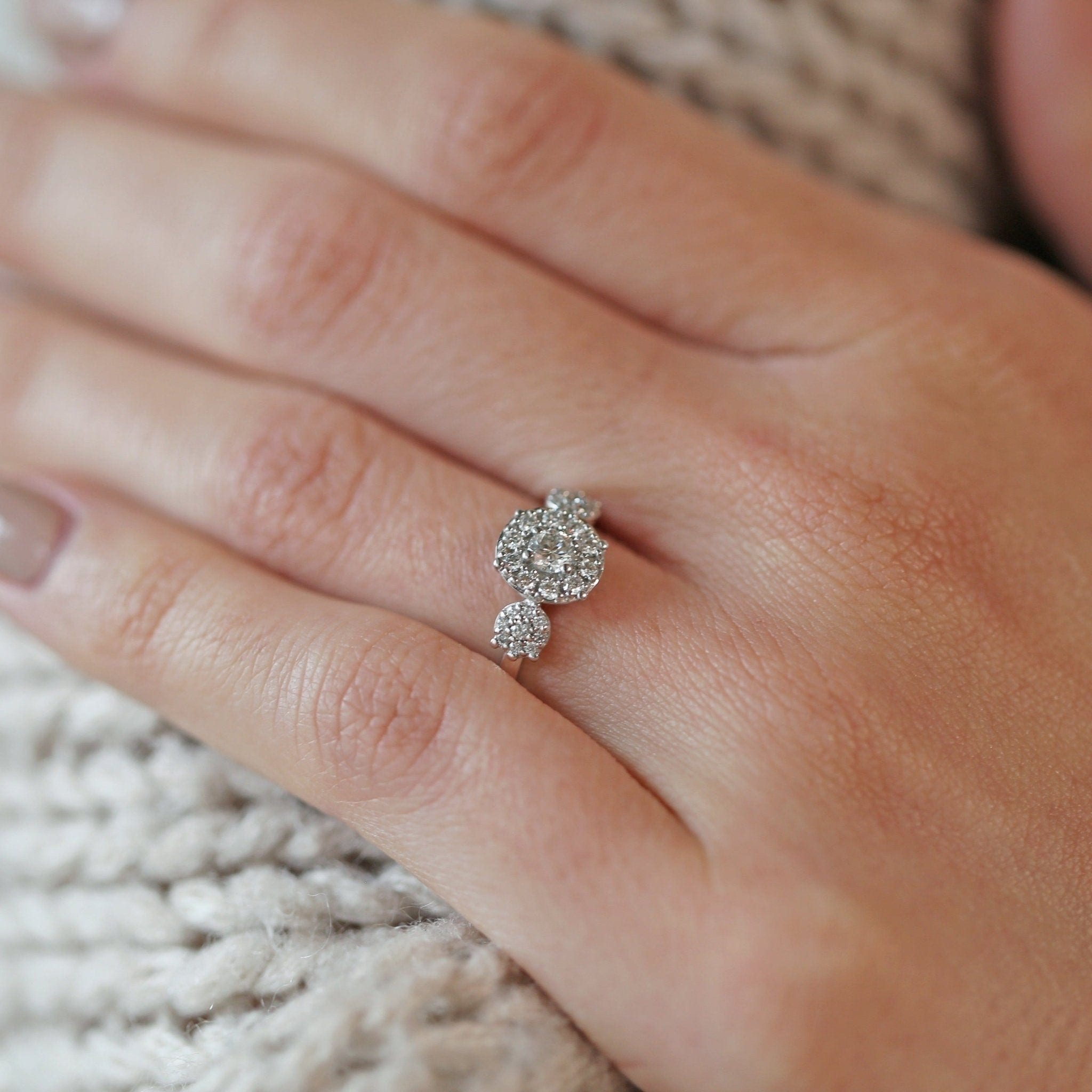 GOLDA ist eines der Highlights unserer Ringkollektion. Es ist ein wunderschöner Verlobungsring, ist aber auch zur Geburt oder zu einem besonderen Anlass ein wunderschönes Geschenk. Durch den Illusion-Effekt wirken die einzelnen Kränze wie drei große Solitäre. Niemand wird den Unterschied sehen, wenn Du ihn am Finger trägst und jede Frau kann stolz mit diesem Ring um die Wette strahlen. Die Fassungskrünze liegen eng an der Ringschiene an und passen sich perfekt der Form des Ringfingers an. GOLDA ist ein eleganter Klassiker, der durch seine feine Form jeden Tag getragen werden kann und auch in Kombination mit einem Ehering sehr elegant aussieht.