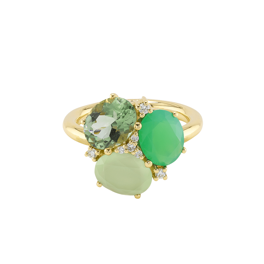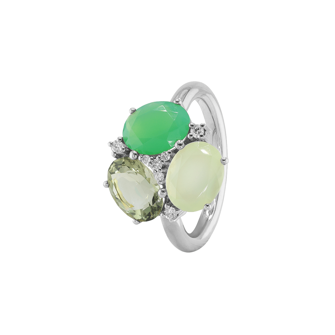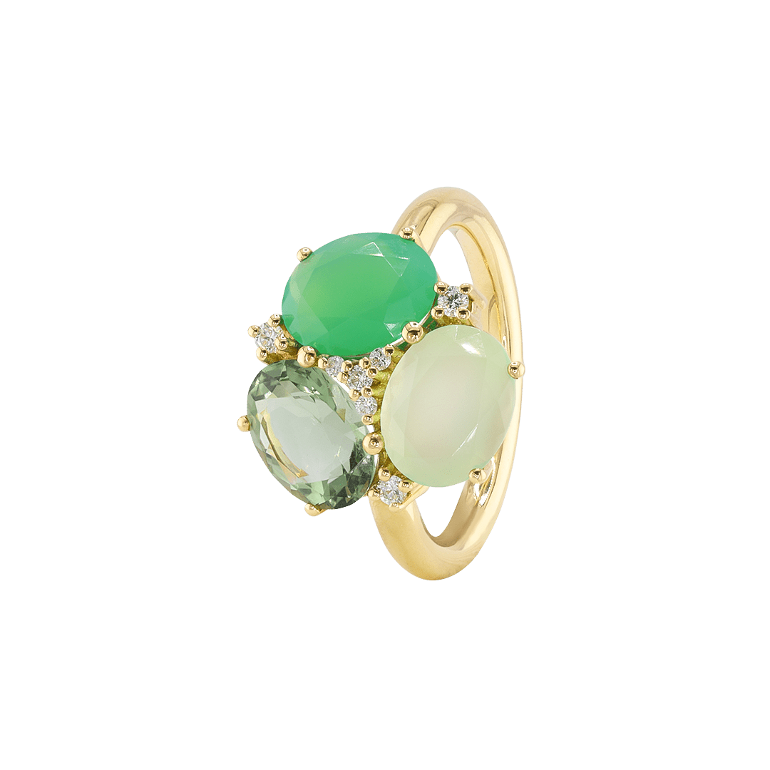 Mit einem strahlenden Chrysopras, der für Erneuerung und emotionales Gleichgewicht steht, einem beruhigenden Calcedon, der Selbstvertrauen und Gelassenheit stärkt, und einem kraftvollen Prasiolith, der Heilung und Liebe fördert, wird der MAIA Green Ring zu einem Sinnbild für Transformation und Stärke.