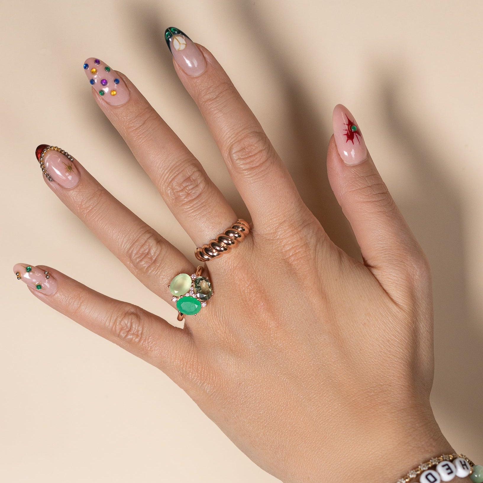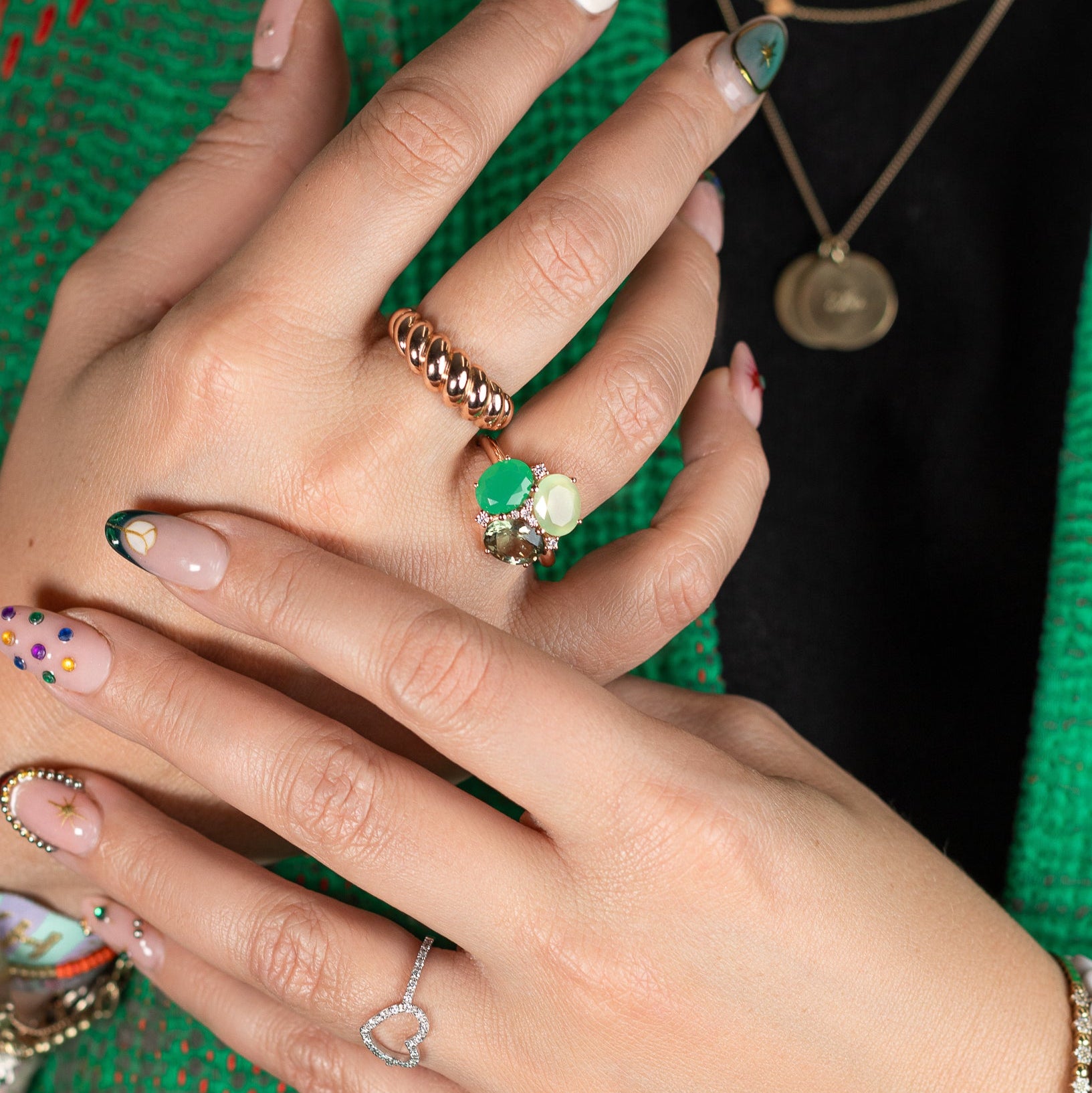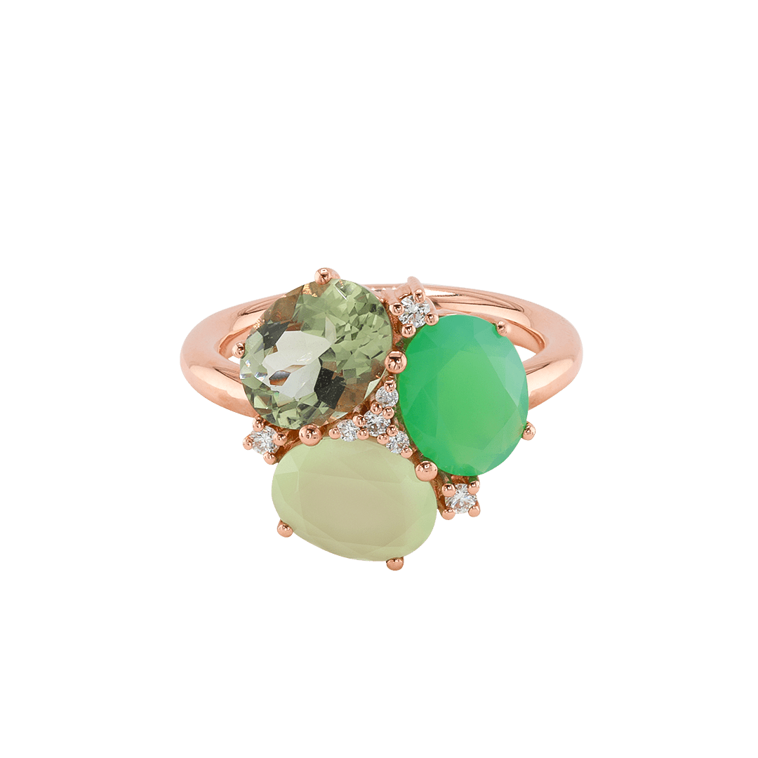 Mit einem strahlenden Chrysopras, der für Erneuerung und emotionales Gleichgewicht steht, einem beruhigenden Calcedon, der Selbstvertrauen und Gelassenheit stärkt, und einem kraftvollen Prasiolith, der Heilung und Liebe fördert, wird der MAIA Green Ring zu einem Sinnbild für Transformation und Stärke.