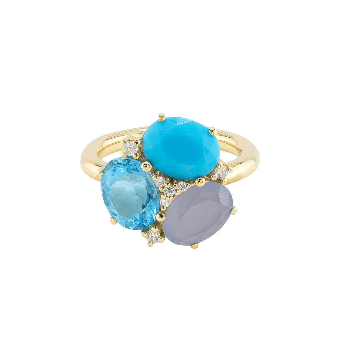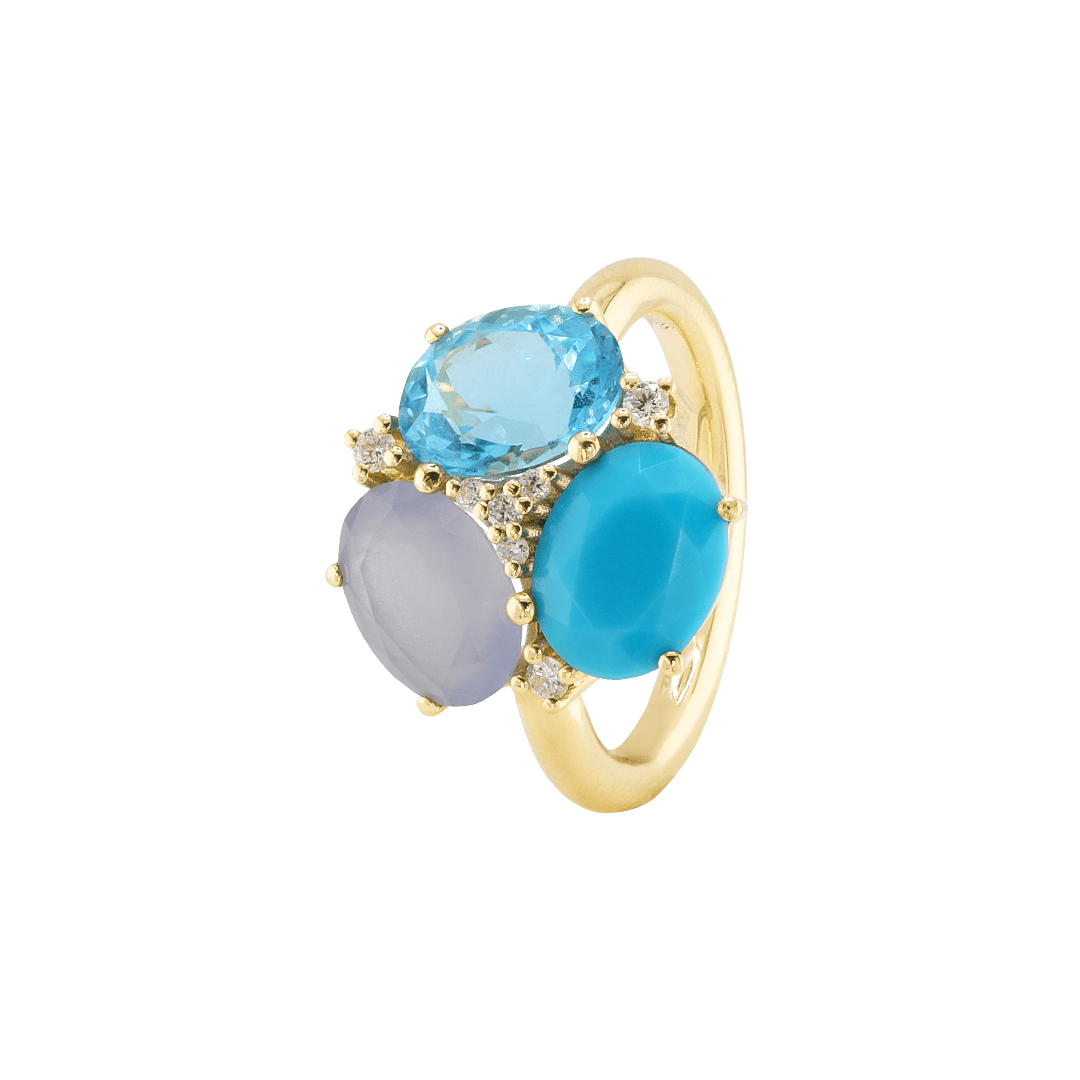 Goldener Ring mit 3 Edelsteinen, umspielt von Diamanten