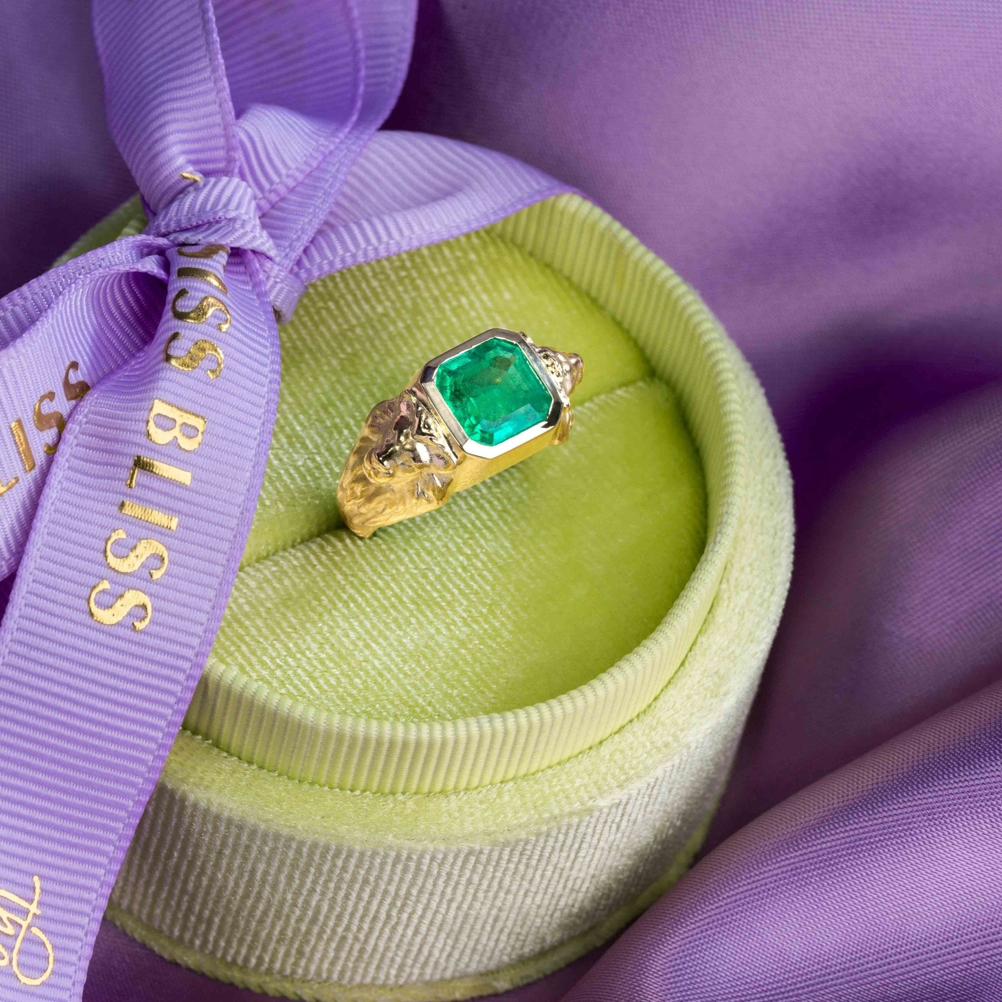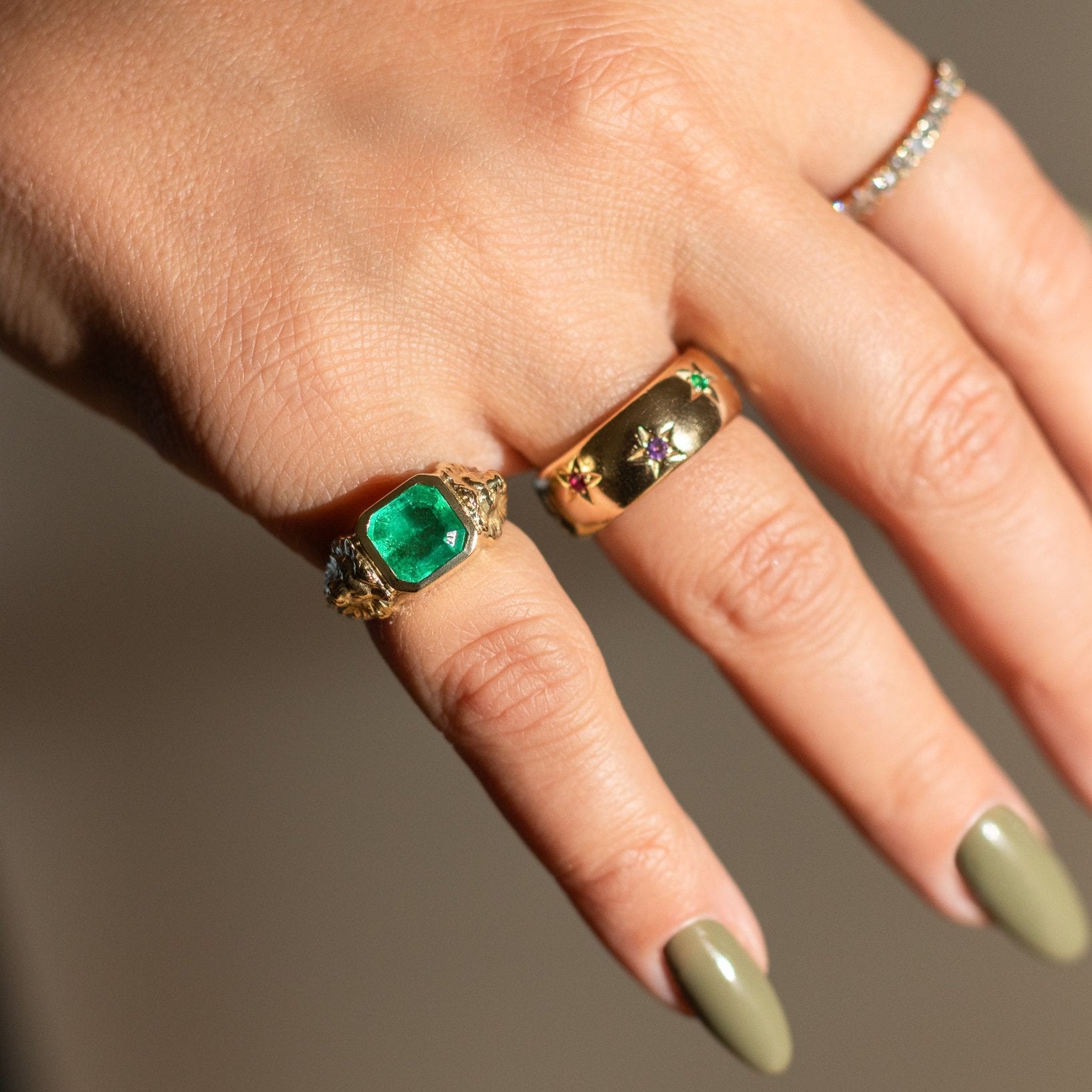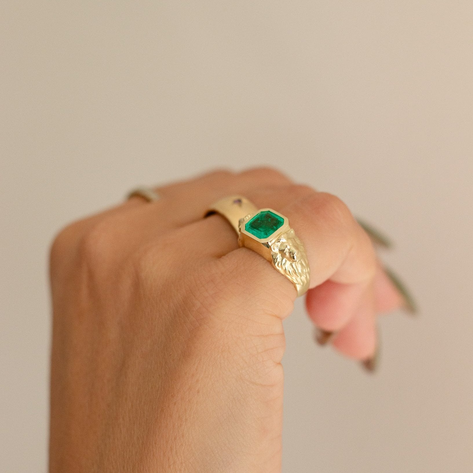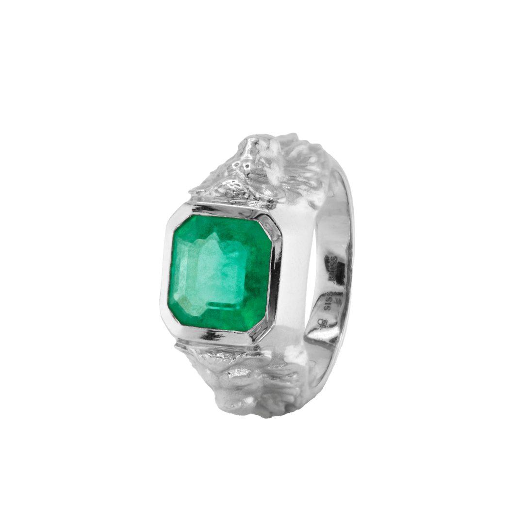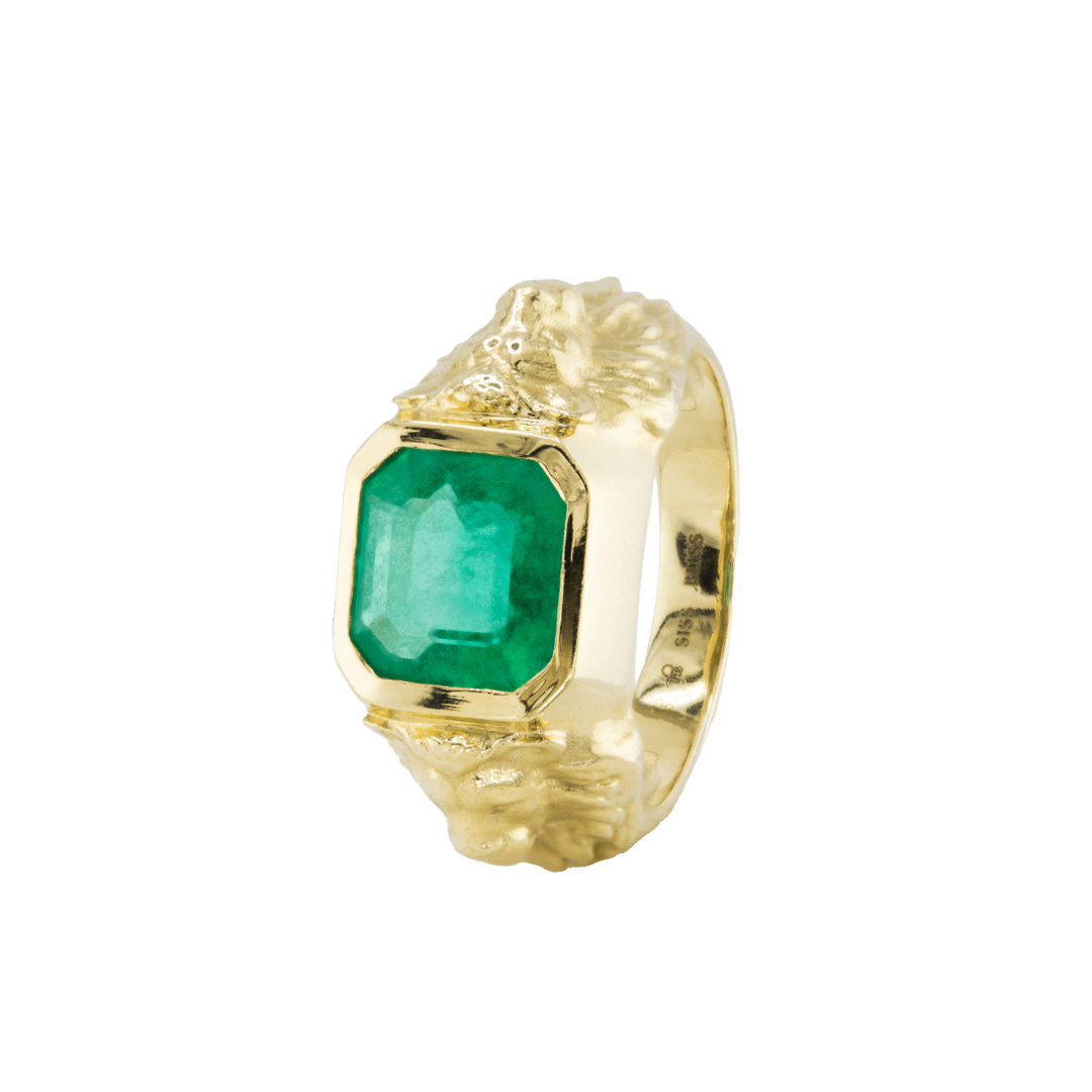 Diese umrahmen einen intensiv grünen Smaragd, der von seiner besonderen Farbe und Präsenz einfach einmalig ist. Von Hand geschliffen in Idar-Oberstein, ist dieser besondere Edelstein die absolute Krönung dieses Rings. Franzi trägt diesen Ring als Statement Piece am kleinen Finger. Aber genauso schön ist NALA auch am Ring- oder Mittelfinger. Wenn Du auf der Suche nach einem Ring bist, der Dir Stärke und Kraft verleiht, dann ist NALA genau das richtige Schmuckstuck für Dich.