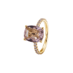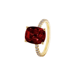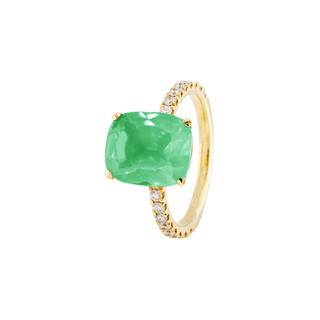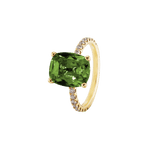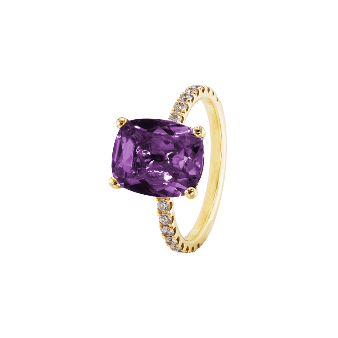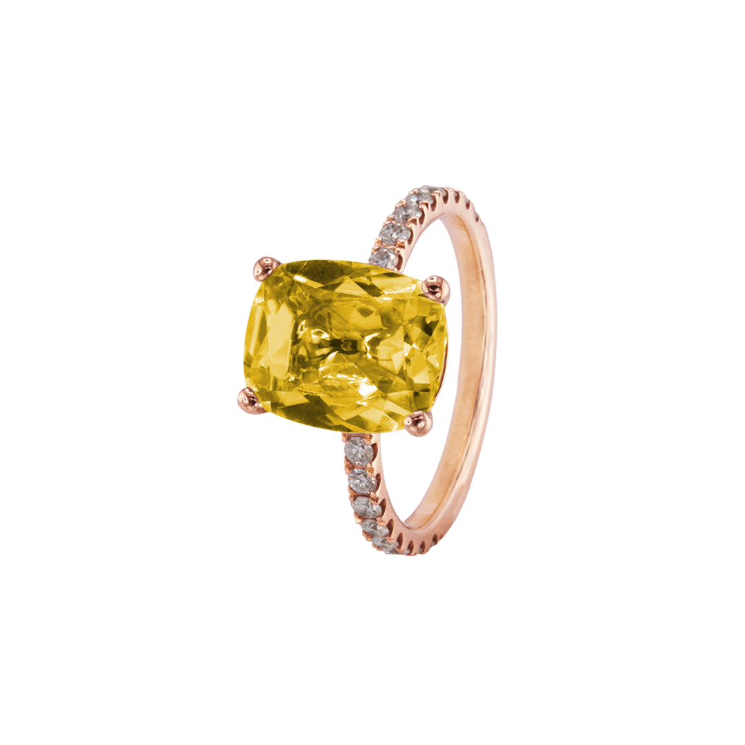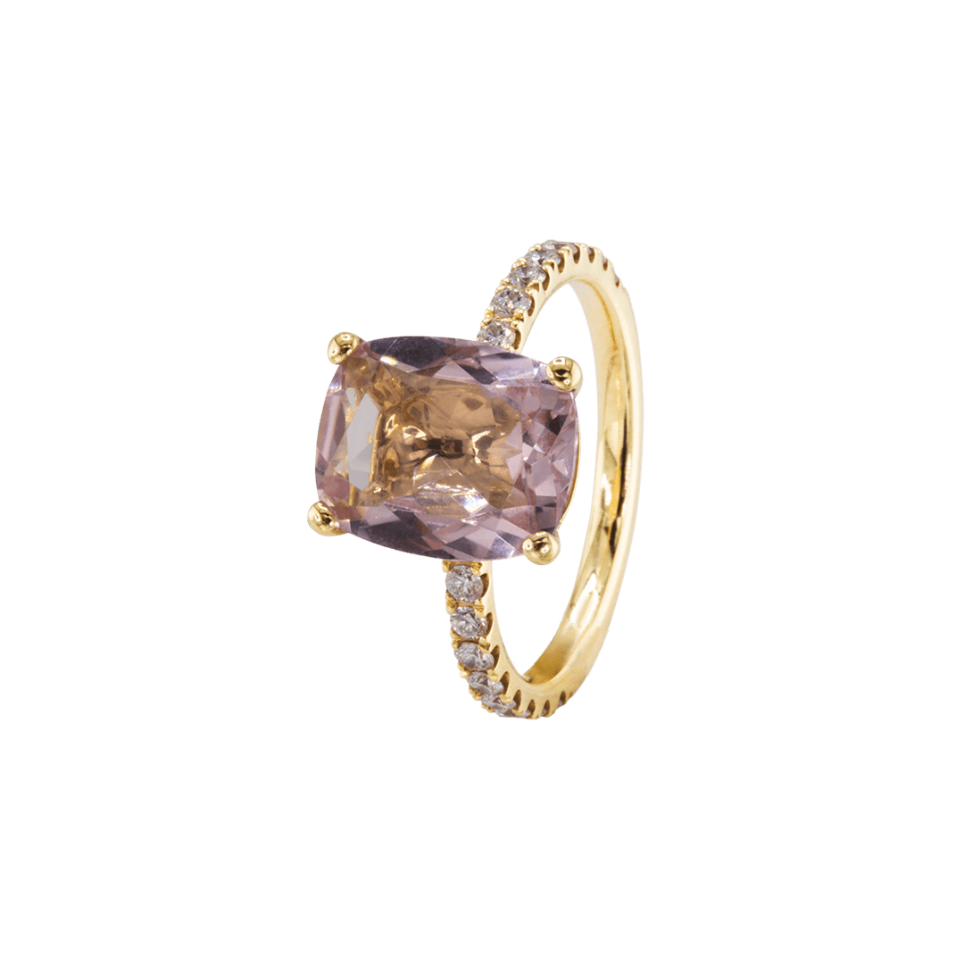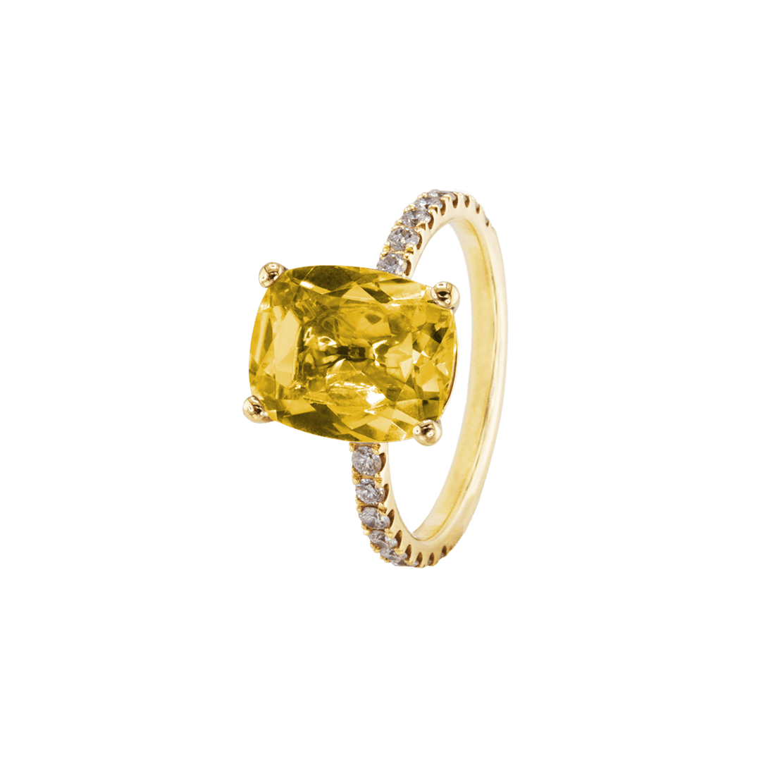 Goldener Ring mit Edelstein im Cushion Cut und diamantbesetzter Ringschiene