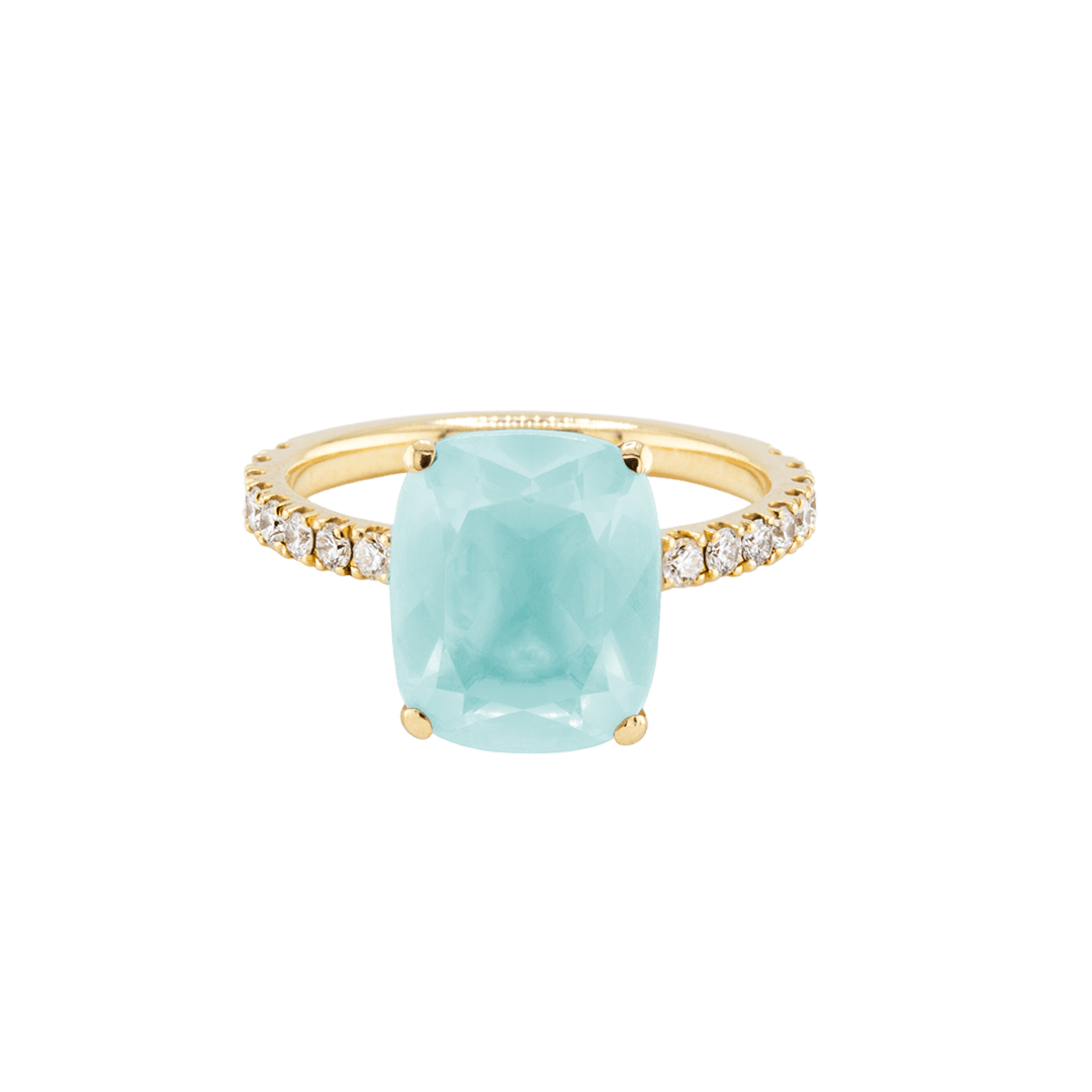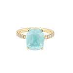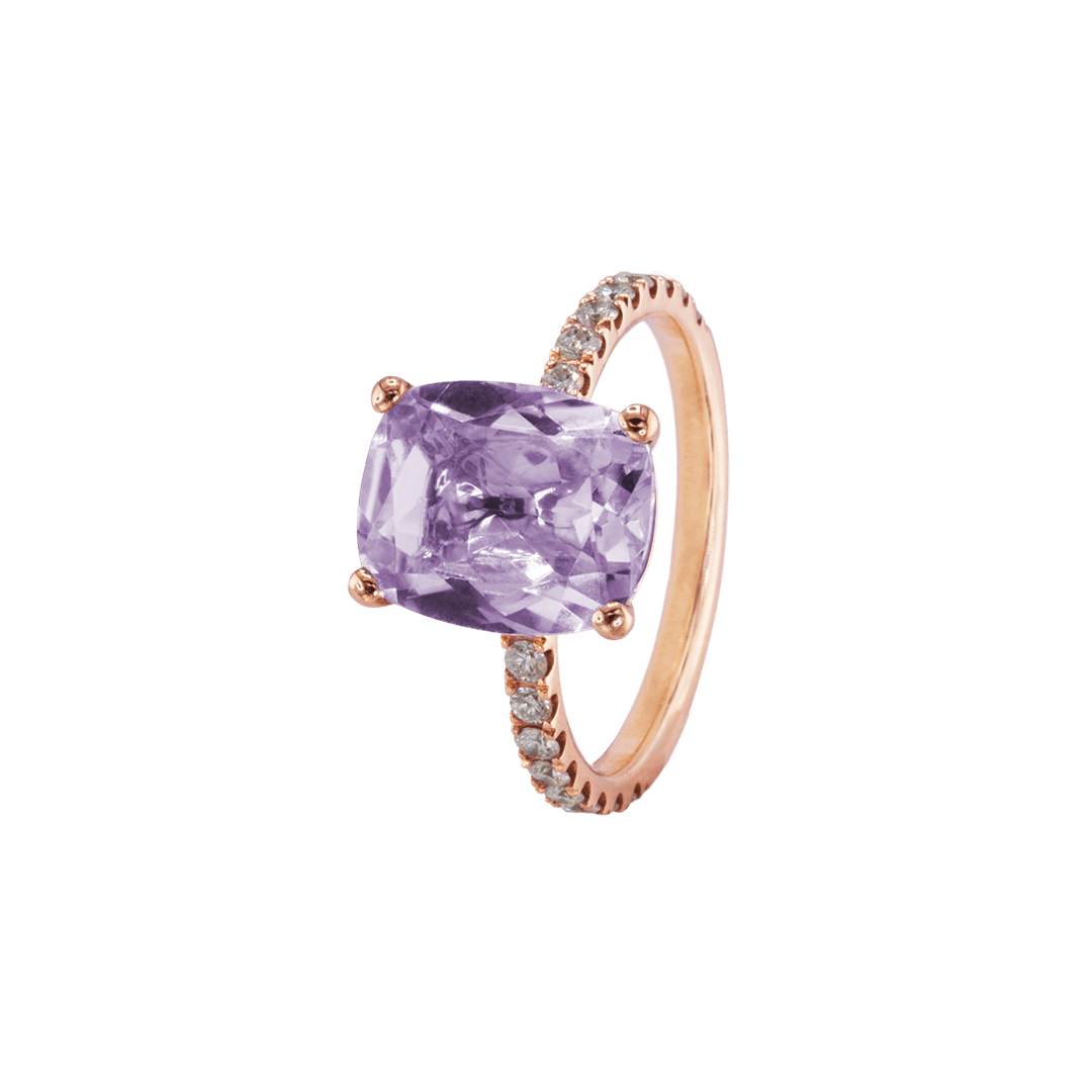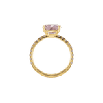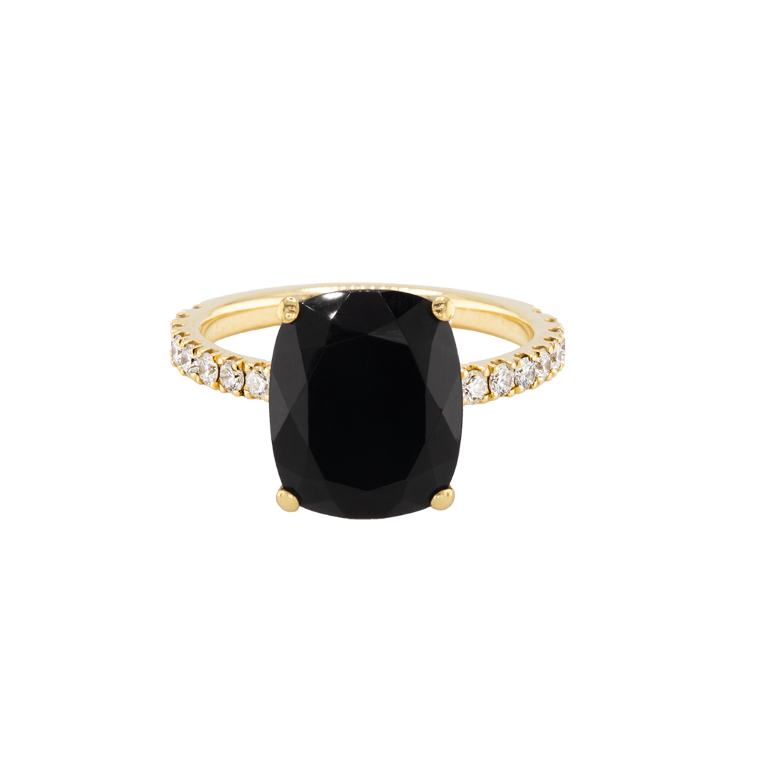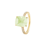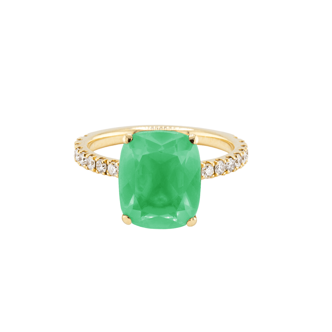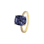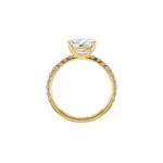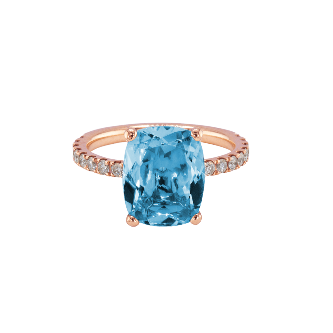 Goldener Ring mit Edelstein im Cushion Cut und diamantbesetzter Ringschiene