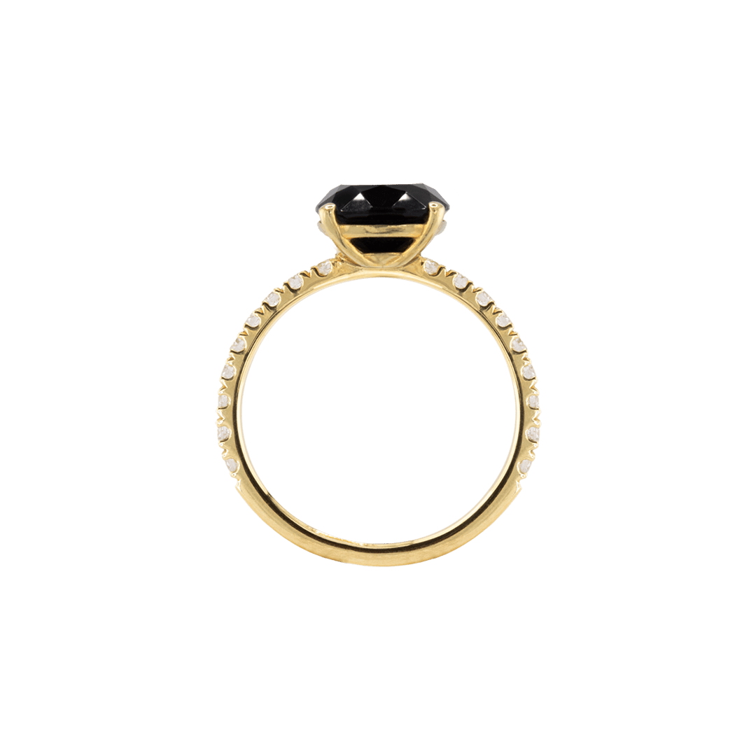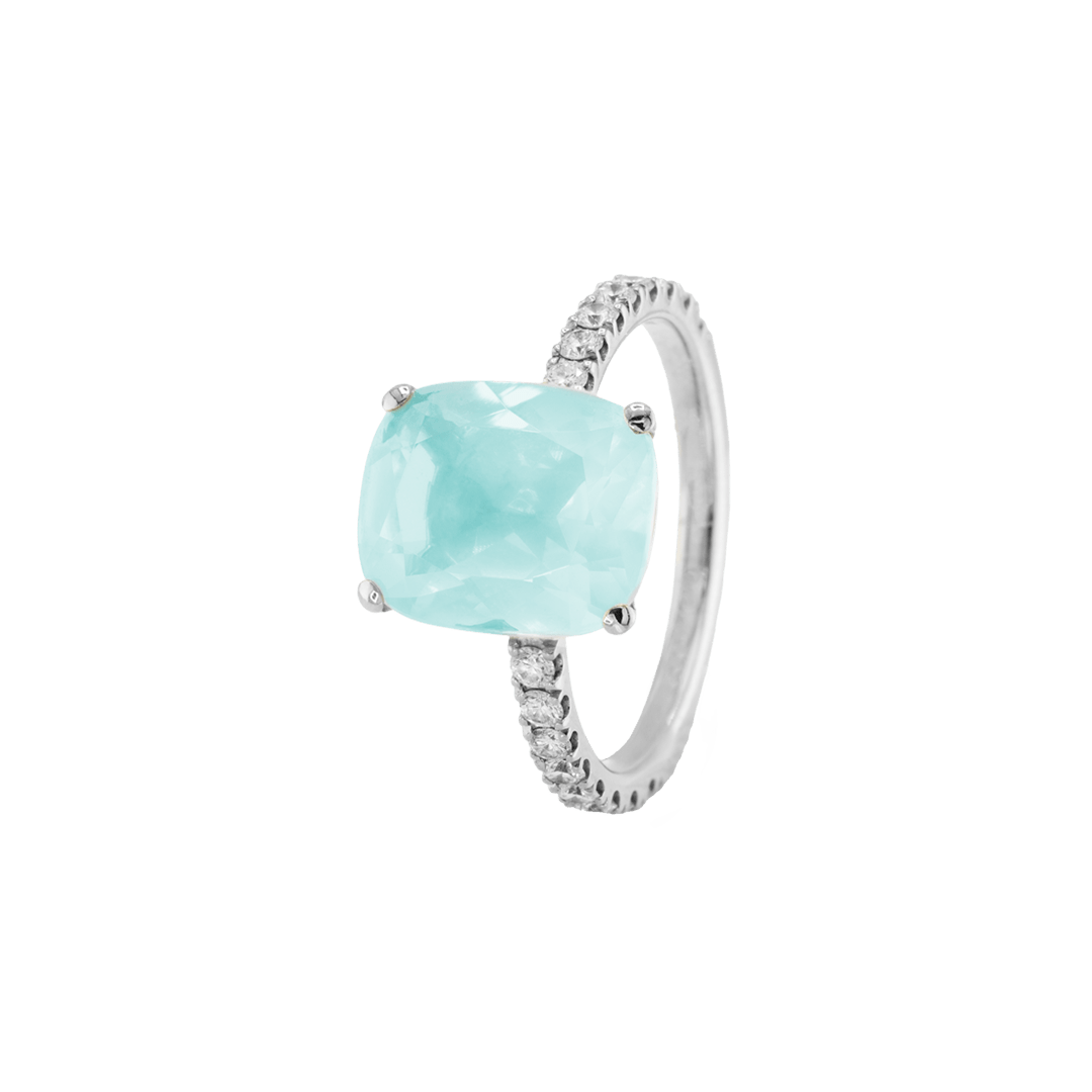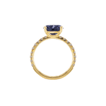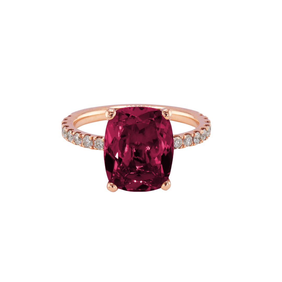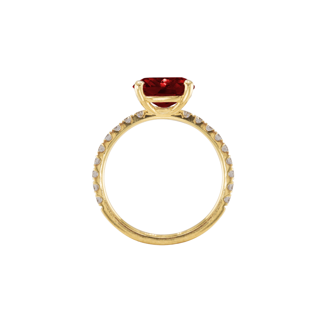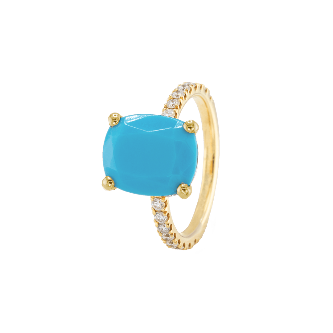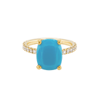 Goldener Ring mit Edelstein im Cushion Cut und diamantbesetzter Ringschiene