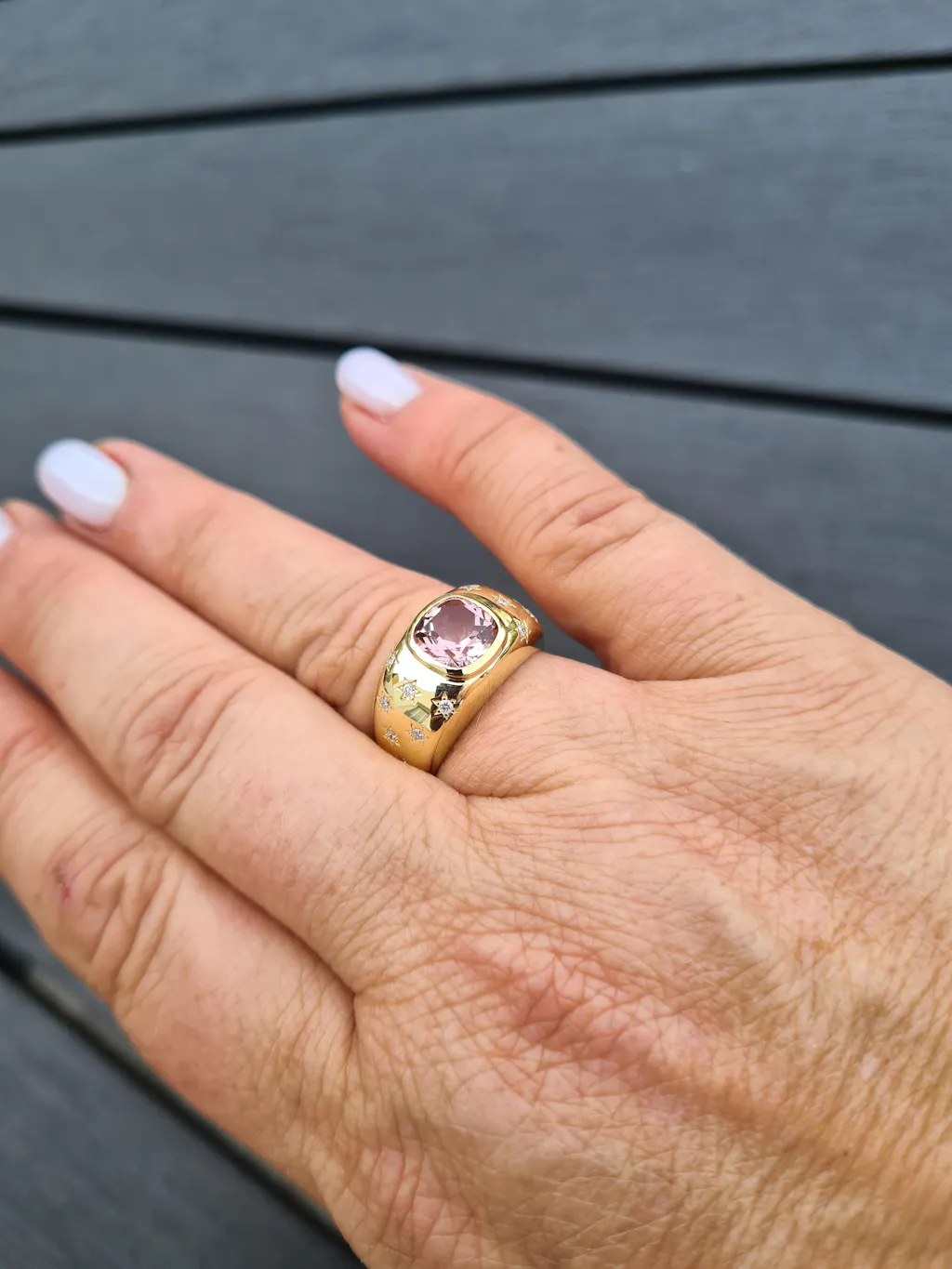 VALENTINA ist ein absoluter Traum, der dich mit jedem Blick verzaubert. Der Ring strahlt durch die vielen funkelnden Diamant-Sterne, die zusammen mit dem mittig platzierten Edelstein eine magische Aura erzeugen. Insgesamt 14 Sterne, die zart mit Diamanten besetzt sind, lassen den Ring in einem einzigartigen Glanz erstrahlen und verleihen ihm einen Hauch von unvergänglicher Eleganz. Ein Schmuckstück, das jeden Moment besonders macht und deine Hand im wahrsten Sinne des Wortes zum Leuchten bringt.
