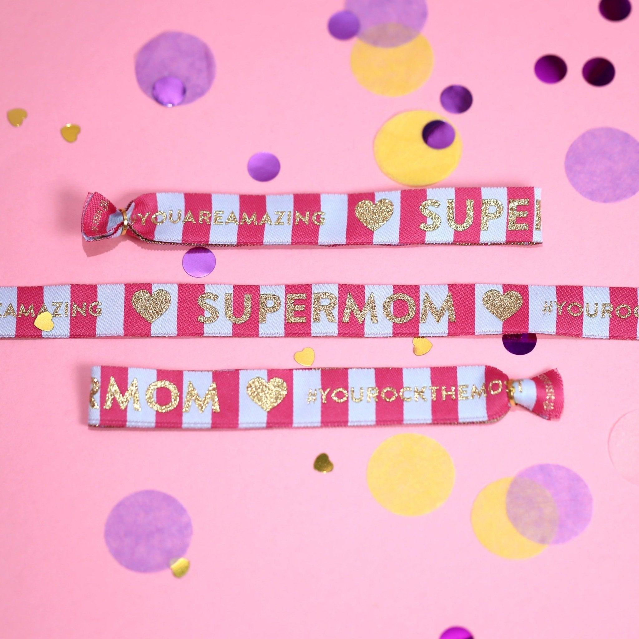 SUPERMOM ist in den Farben Pink & Hellblau gehalten, die Schrift ist aus goldenem Lurexfaden.