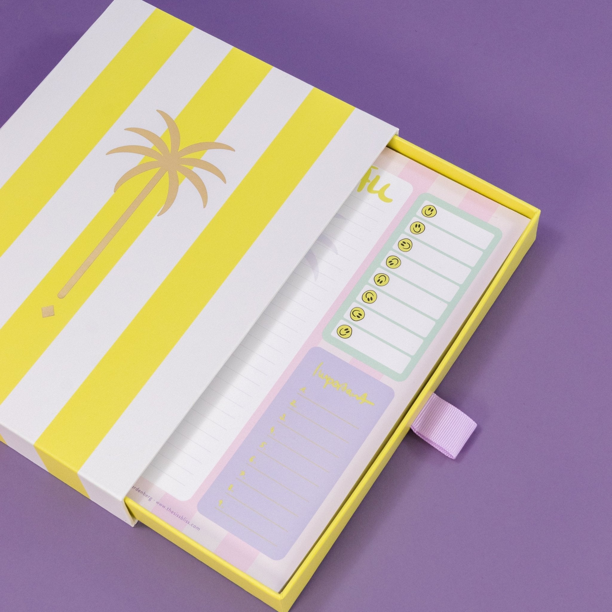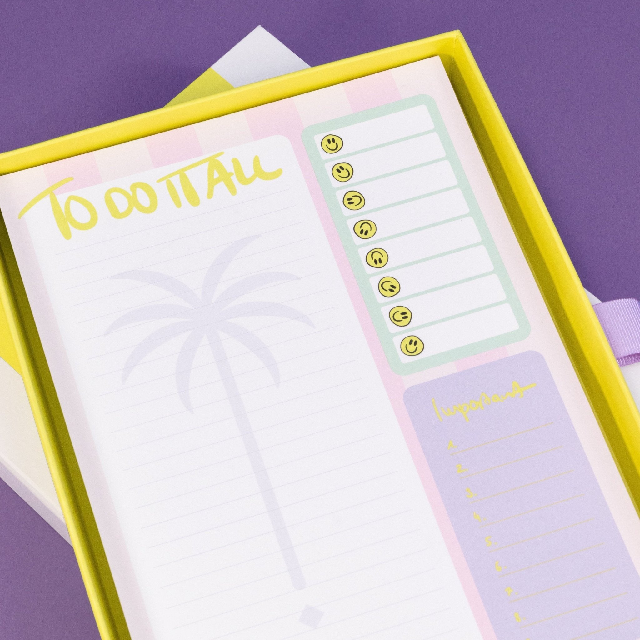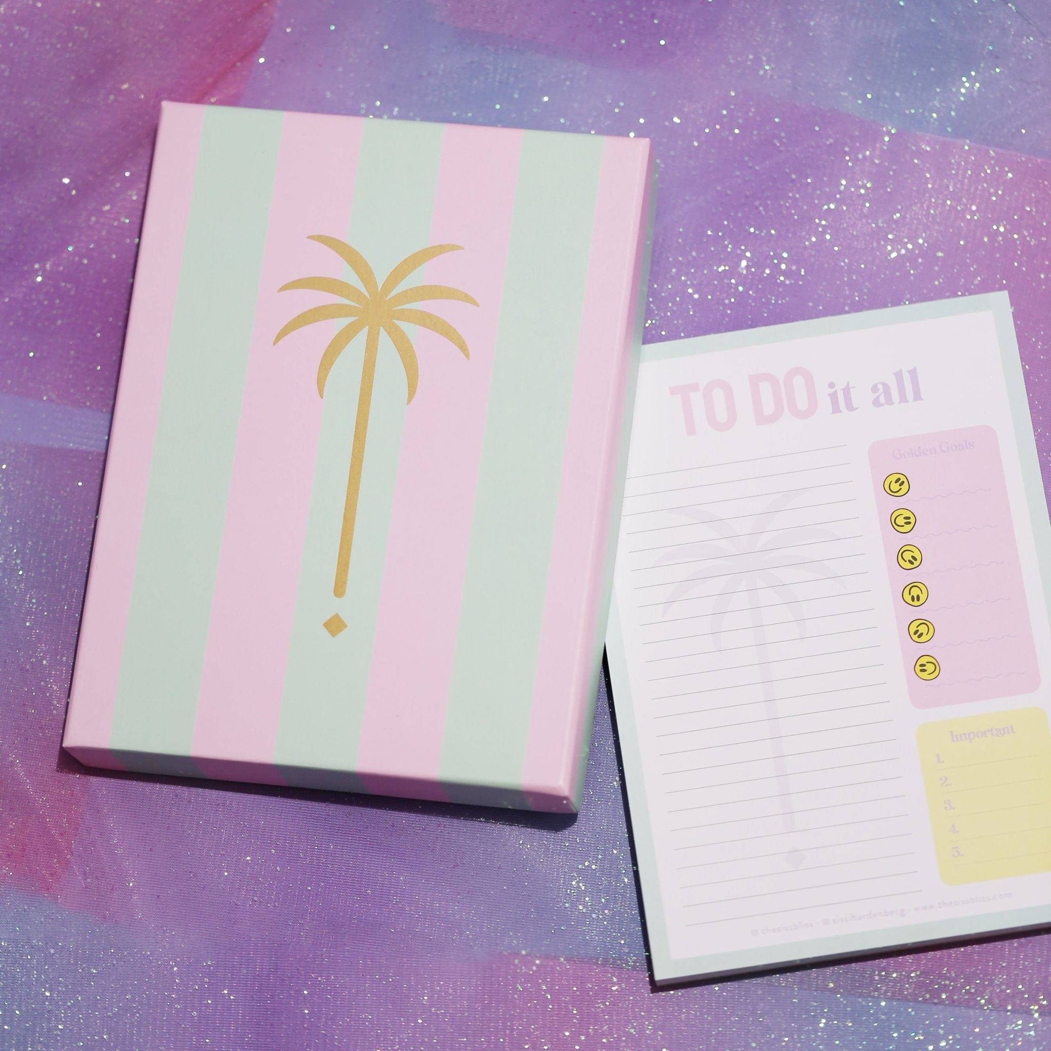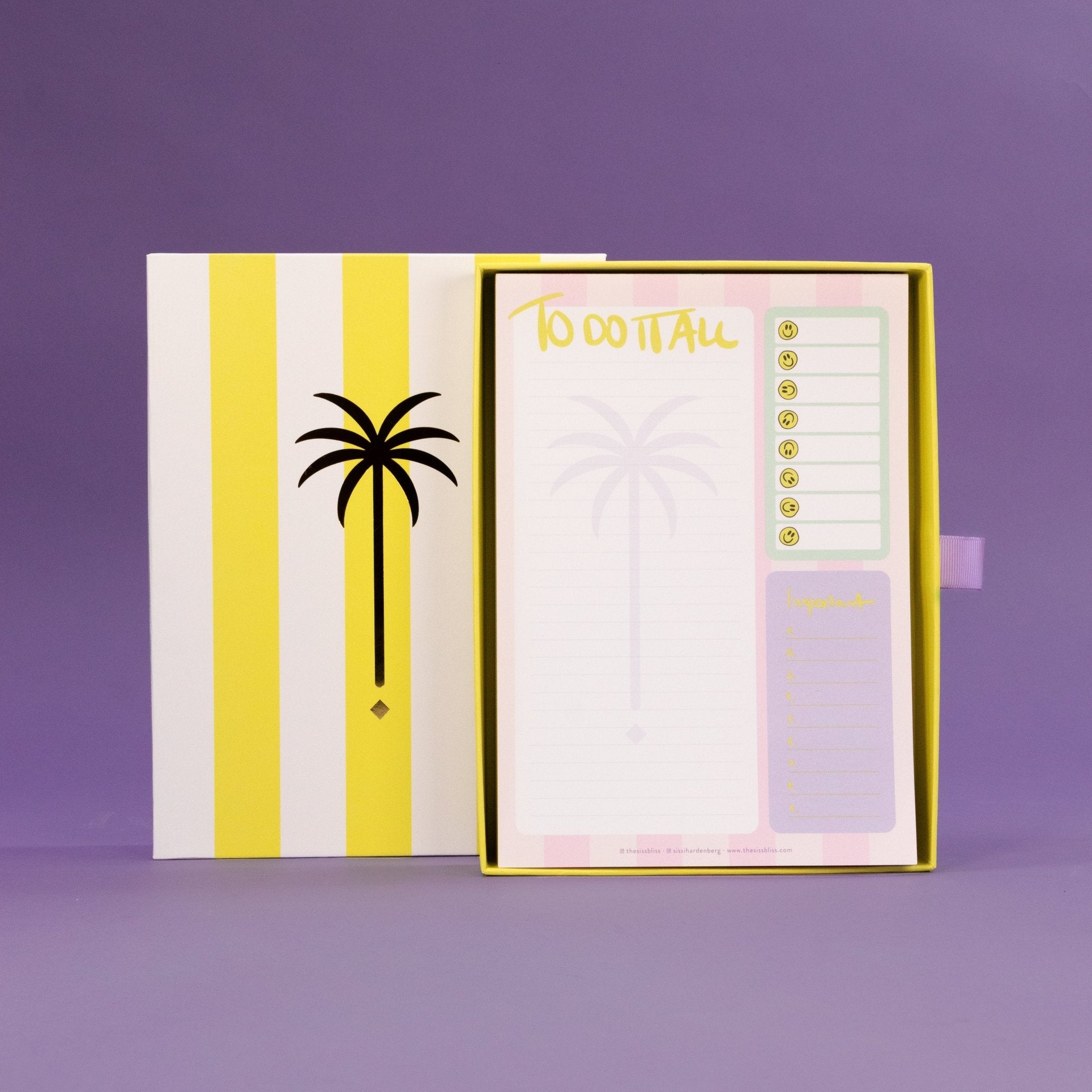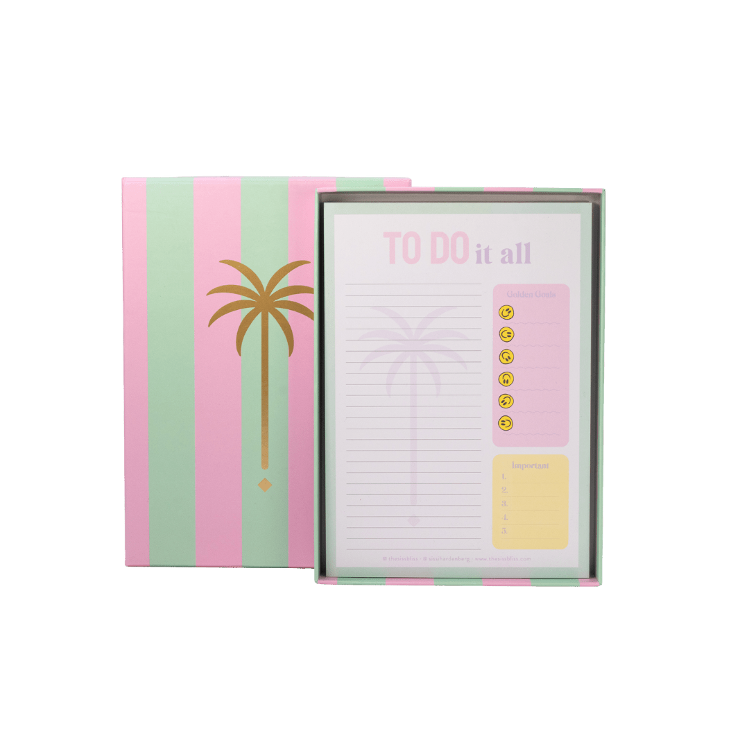 Unser TO DO IT ALL Notizblock kommt in einer super schönen und praktischen Box mit PALMY gleich dazu. So hast Du zusätzlich zum Notizblock noch eine praktische (Geschenk-) Verpackung dabei. In der Box kannst Du den Block außerdem sicher auf Deinem Schreibtisch im Büro aufbewahren, so dass all Deine schlauen Gedanken und Ideen immer an einem perfekten Platz haben, bis sie zum Einsatz kommen!